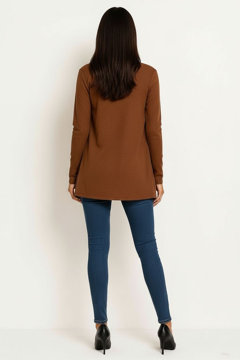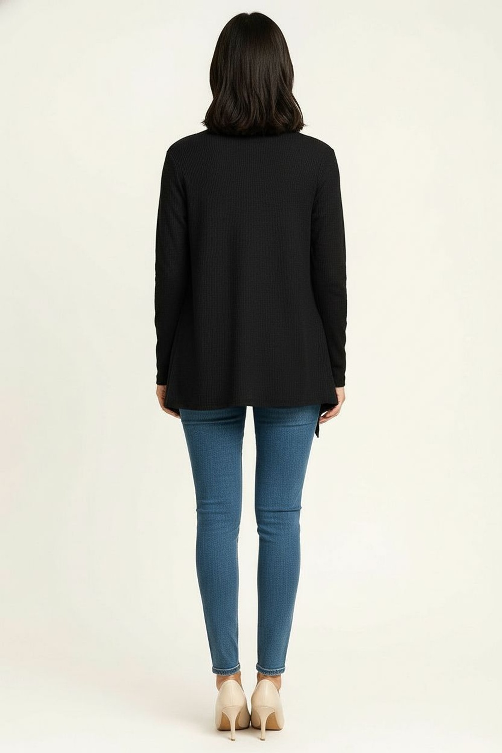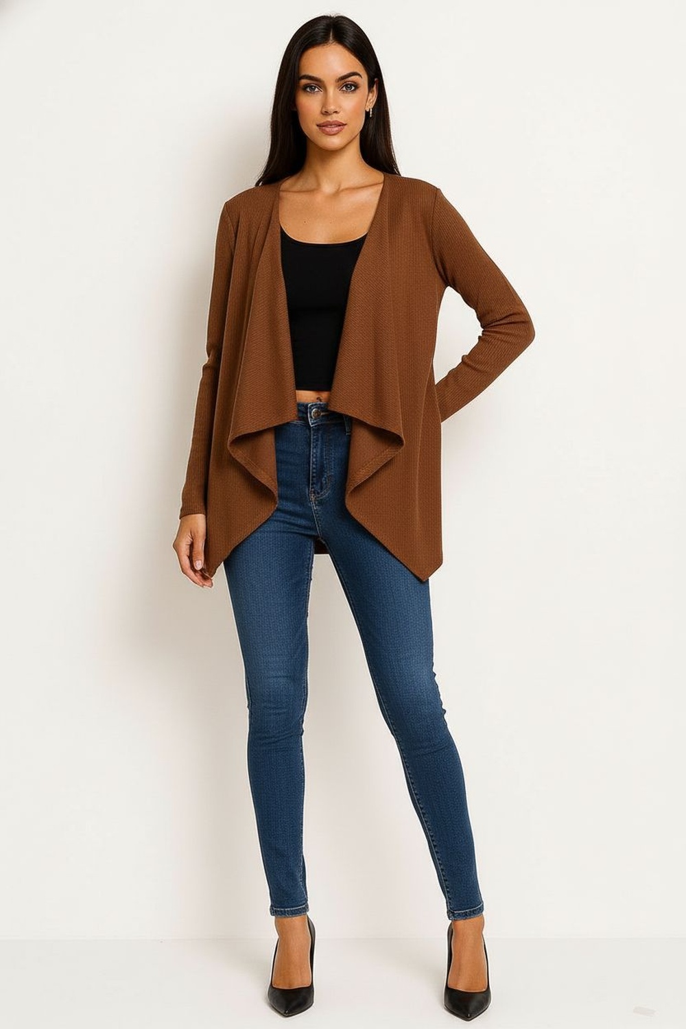 Cardigán con solapa abierta y caída fluida al frente, confeccionado en punto suave con textura fina que proporciona comodidad, mangas largas con ajuste relajado, largo asimétrico que aporta movimiento natural y acabado limpio en bordes que ofrece un look pulido y versátil