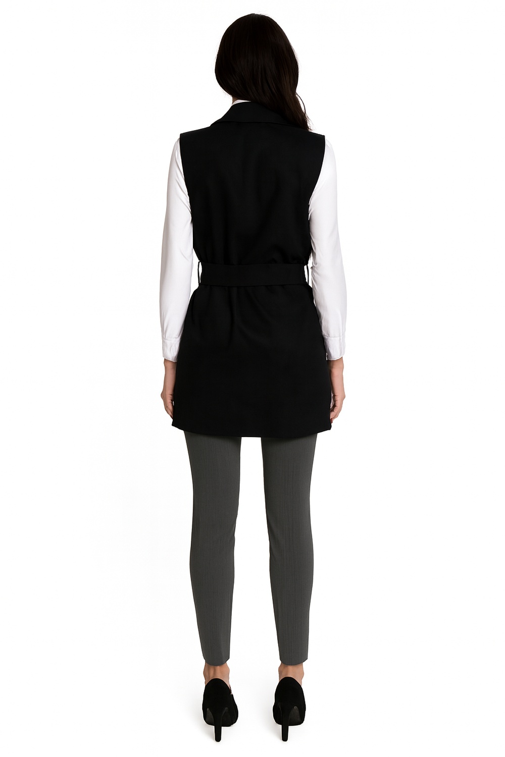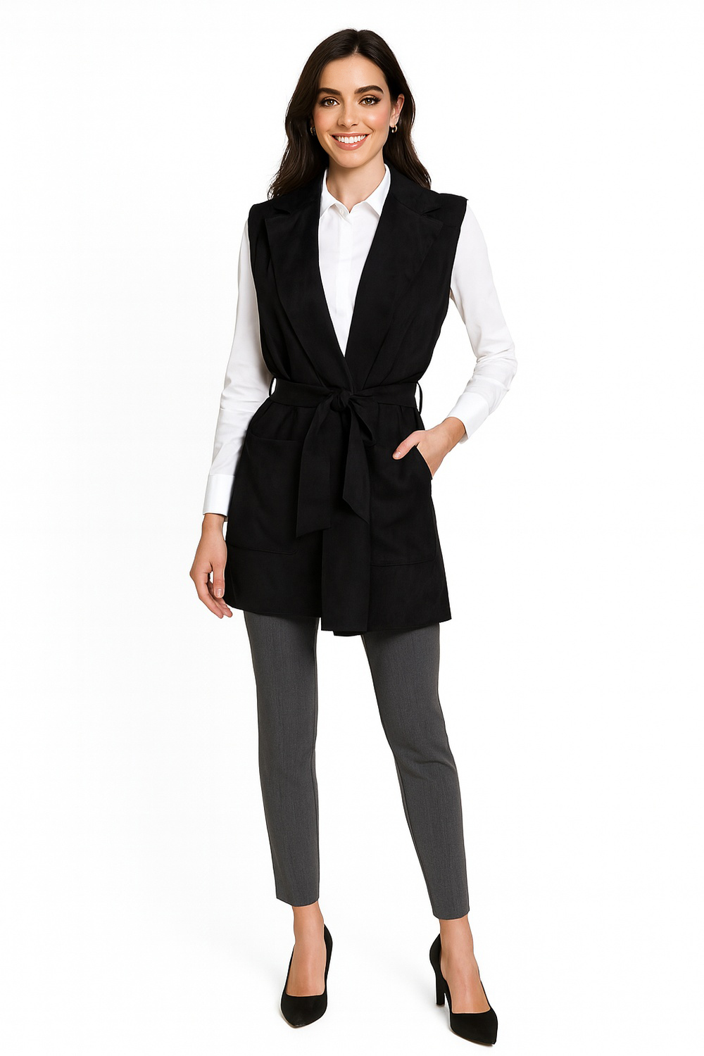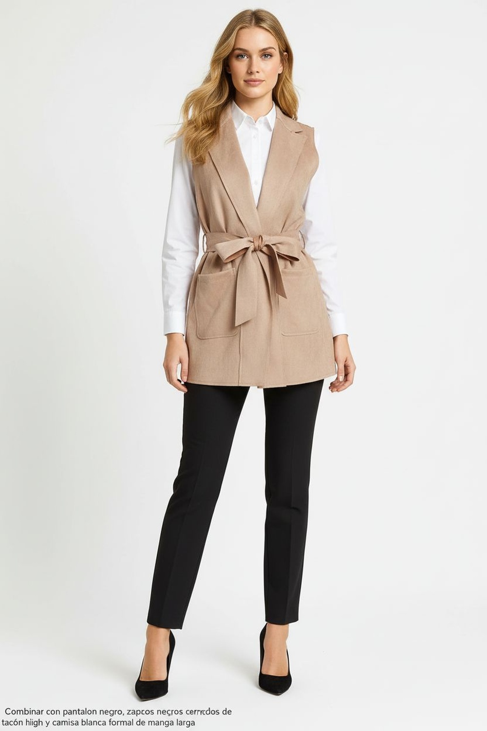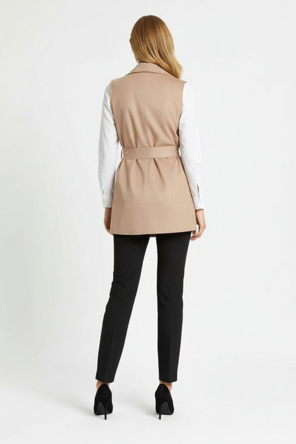 Chaleco abierto de corte recto que brinda versatilidad y comodidad, cuello con solapa que aporta un toque clásico y elegante, cinturón de amarre a la cintura que permite ajustar y definir la silueta, bolsillos frontales funcionales que añaden practicidad, confección en tela suave de caída ligera que asegura confort, dobladillo recto que refuerza la estructura y durabilidad de la prenda