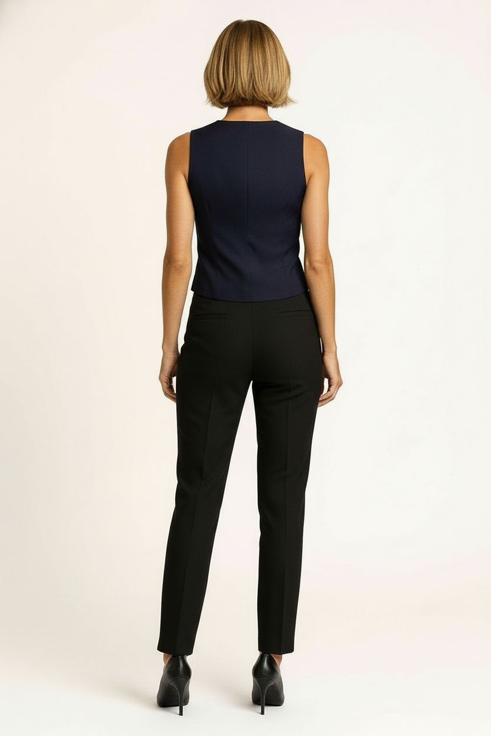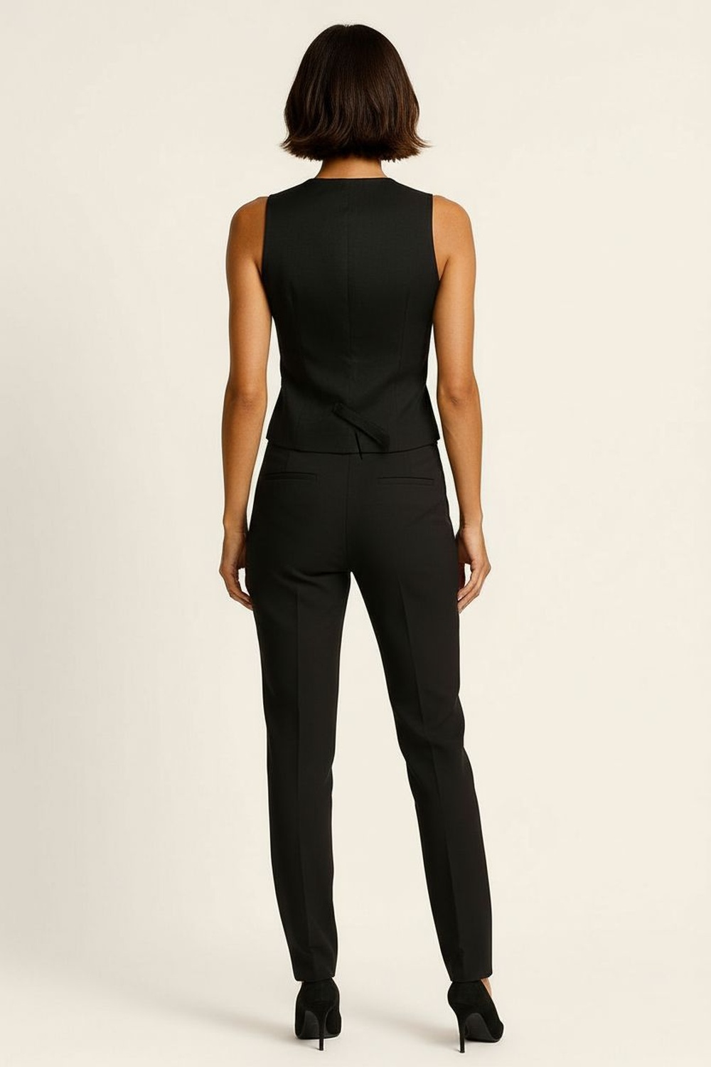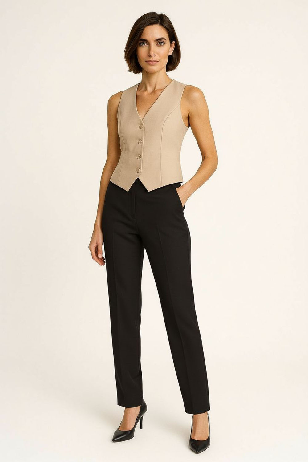 Chaleco con diseño estructurado y escote en pico, cuatro botones al frente que permiten cierre ajustado, pinzas que realzan la figura y costuras uniformes para acabado prolijo, confeccionado en tela firme con textura ligera