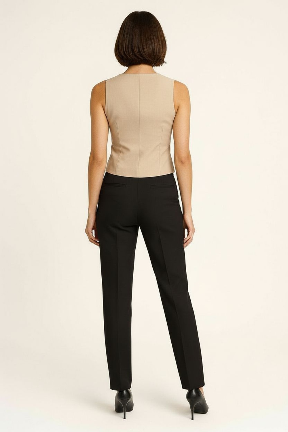 Chaleco corto con escote cuadrado y corte estructurado que define la silueta con precisión, botonadura de pasta en tono a juego que aporta calidez visual, diseño sin mangas ideal para usar solo o en capas, silueta entallada perfecta para resaltar cintura y crear contraste, prenda versátil que mezcla estilo sastre con vibra urbana, ideal para looks casual chic o de oficina reinventados