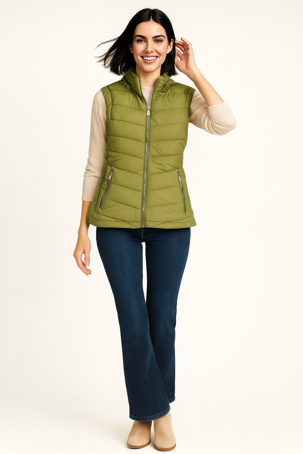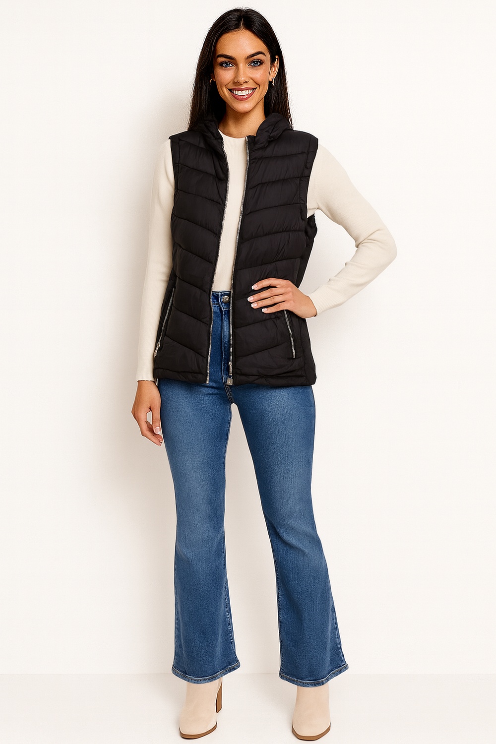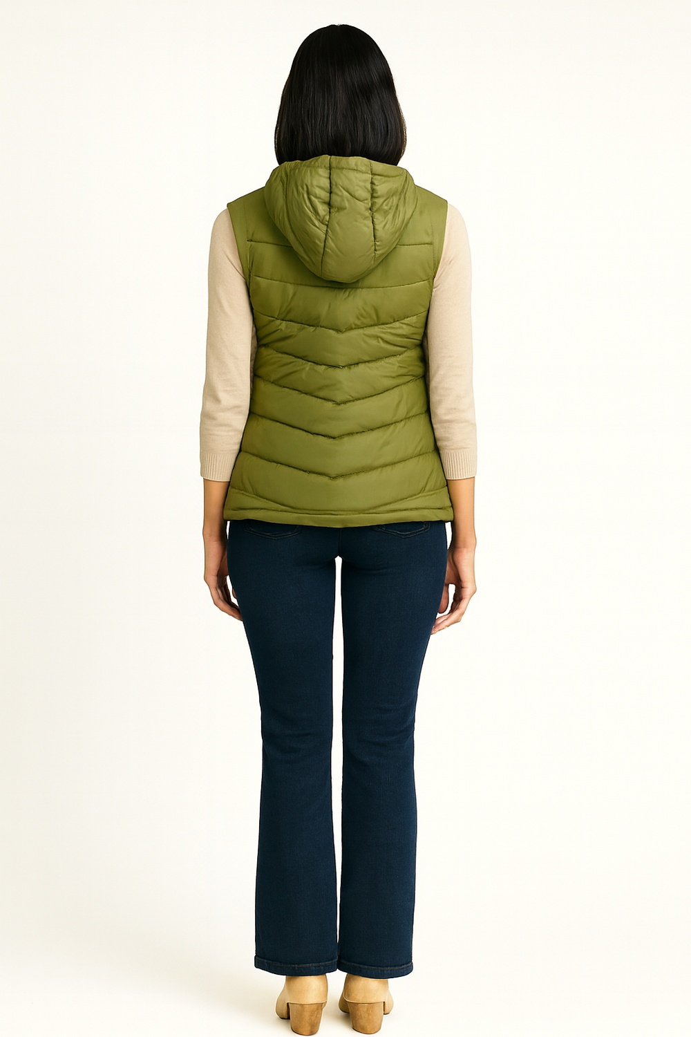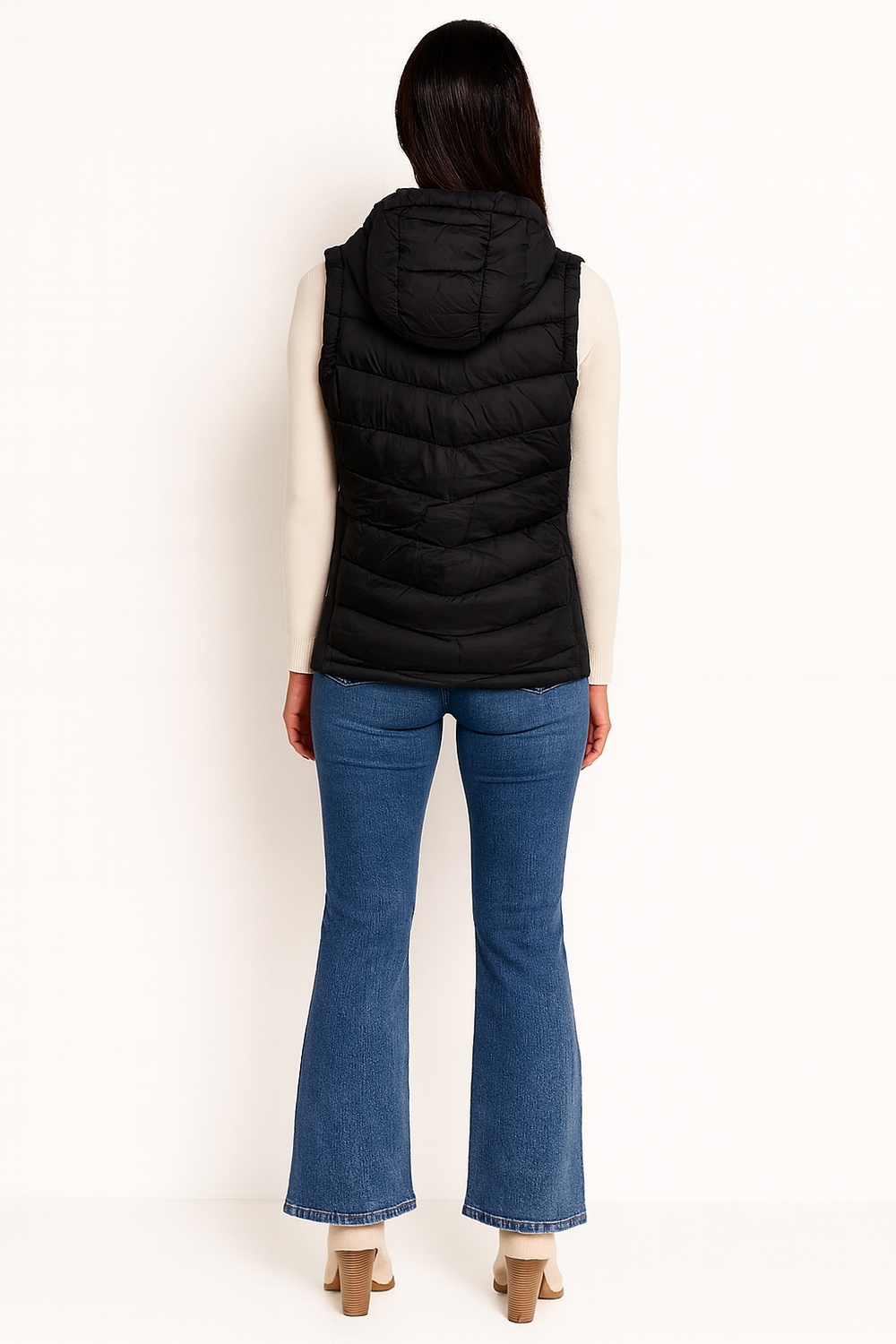 Chaleco acolchado con capucha integrada que proporciona protección en la zona superior, cierre frontal que asegura ajuste al cuerpo, bolsillos laterales funcionales con cierre que permiten resguardar objetos, confección capitonada que distribuye el volumen de manera uniforme y brinda sensación térmica confortable
