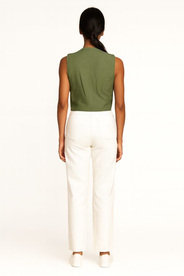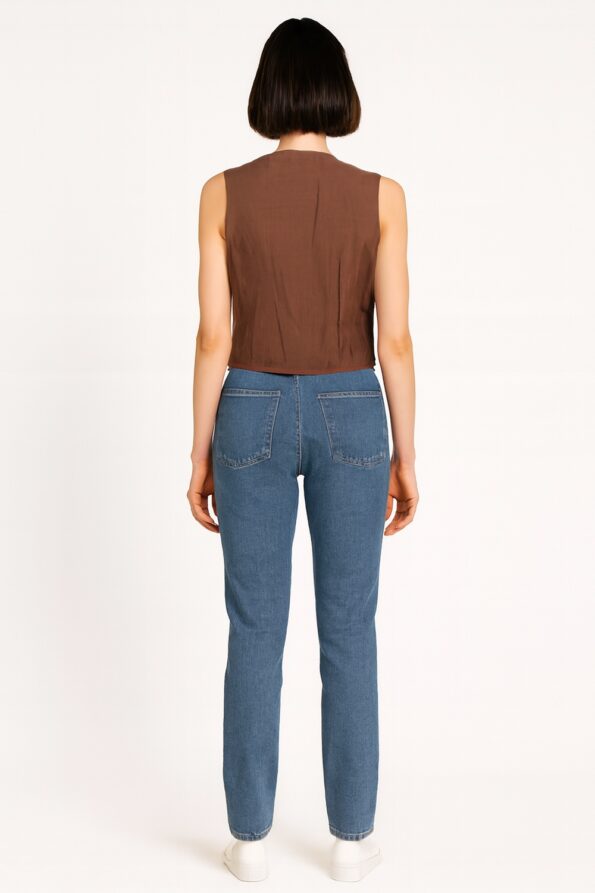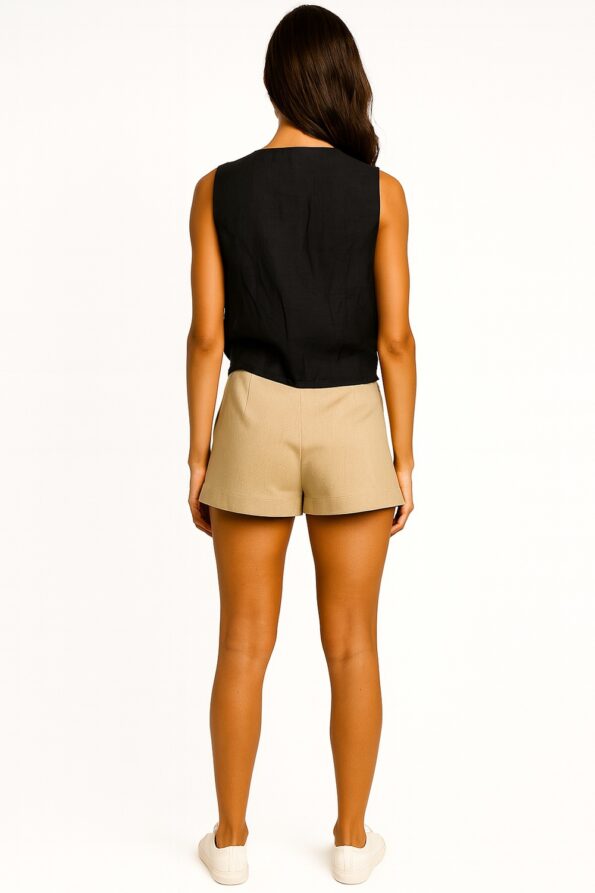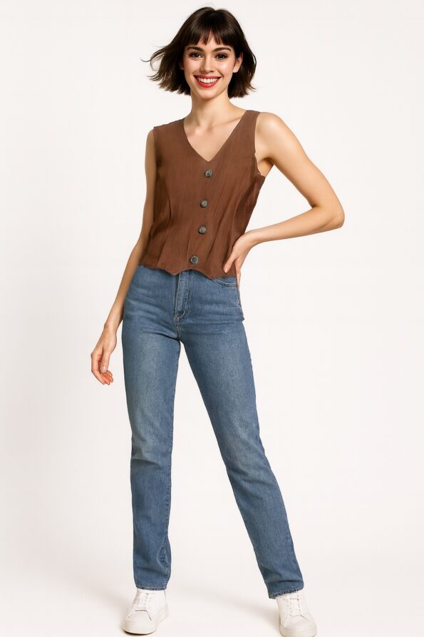 Chaleco corto con escote en V profundo que estiliza el cuello, botones al frente que aportan practicidad y detalle decorativo, bajo en punta que alarga visualmente la silueta, sin mangas para mayor frescura y fácil combinación con diferentes prendas, confeccionado en tejido estructurado que brinda soporte y mejor caída, ideal para looks modernos y combinaciones versátiles de temporada