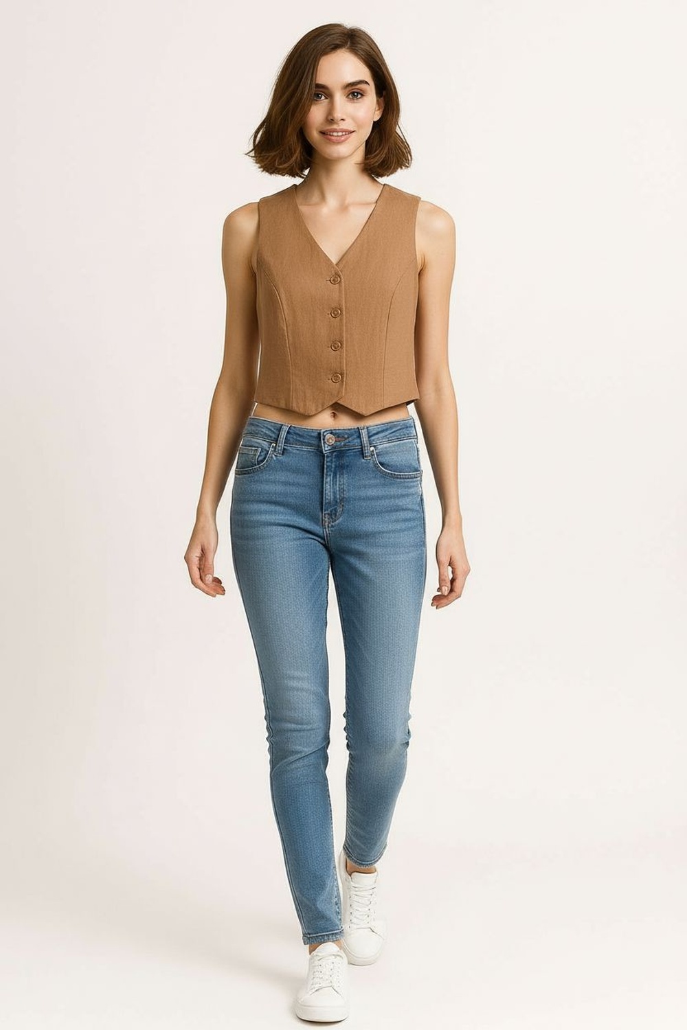 Chaleco sin mangas con escote en V pronunciado y botonadura frontal funcional, corte recto ligeramente corto que marca la línea de cintura, estructura limpia con ajuste cómodo en torso, confección en tejido de textura suave que aporta firmeza y comodidad, terminación recta en bajo que estiliza la figura