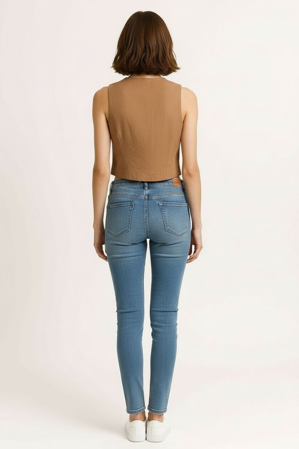 Chaleco de mezclilla con corte entallado que define la figura, solapa clásica y botonadura frontal metálica que aporta estructura, diseño sin mangas que permite mayor versatilidad, pinzas delanteras y traseras que mejoran el ajuste al cuerpo, bajo en pico que estiliza la zona de la cintura y acabado firme de alta resistencia