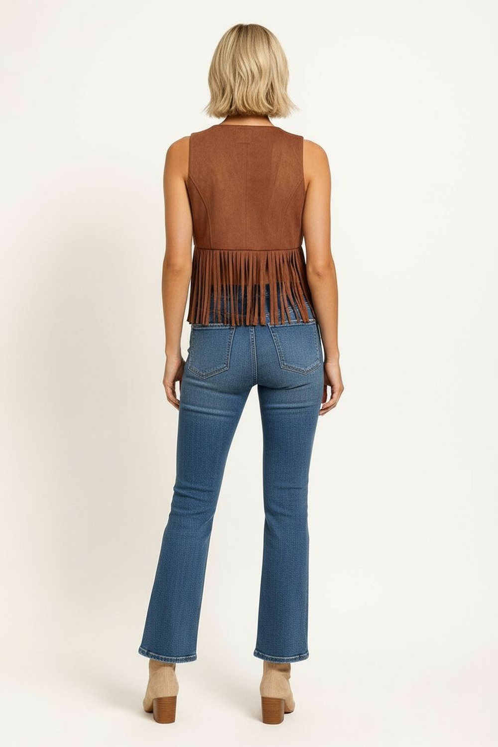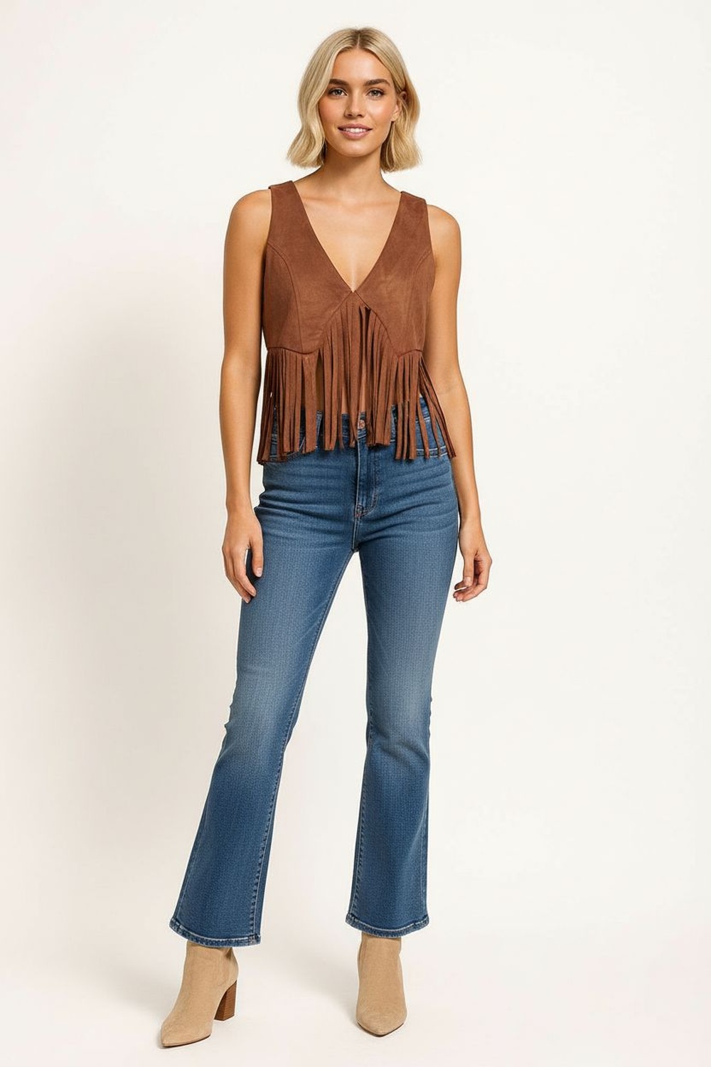 Chaleco de corte corto sin mangas con escote en pico pronunciado, detalle de flecos decorativos en el borde inferior que aportan movimiento y estilo, confección en tejido tipo gamuza suave que ofrece textura agradable al tacto, estructura ligera que se ajusta al cuerpo y permite combinar fácilmente con otras prendas, acabado limpio y resistente, no incluye top