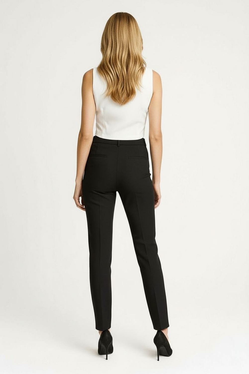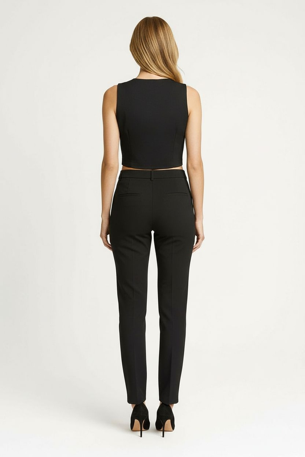 Chaleco tipo sastre con solapa estructurada y escote en V que estiliza el torso, cierre frontal con botones que aporta ajuste preciso, corte entallado con pinzas que define la cintura, bolsillos de solapa funcionales que suman detalle práctico, confección en tela de cuerpo firme con acabado limpio y elegante