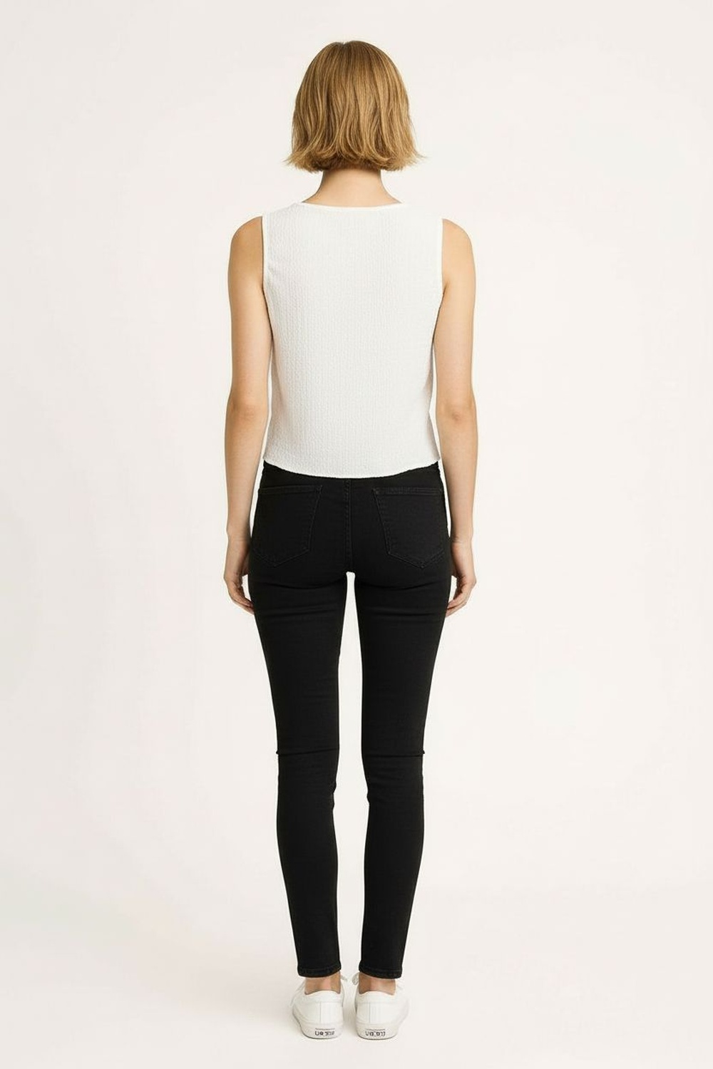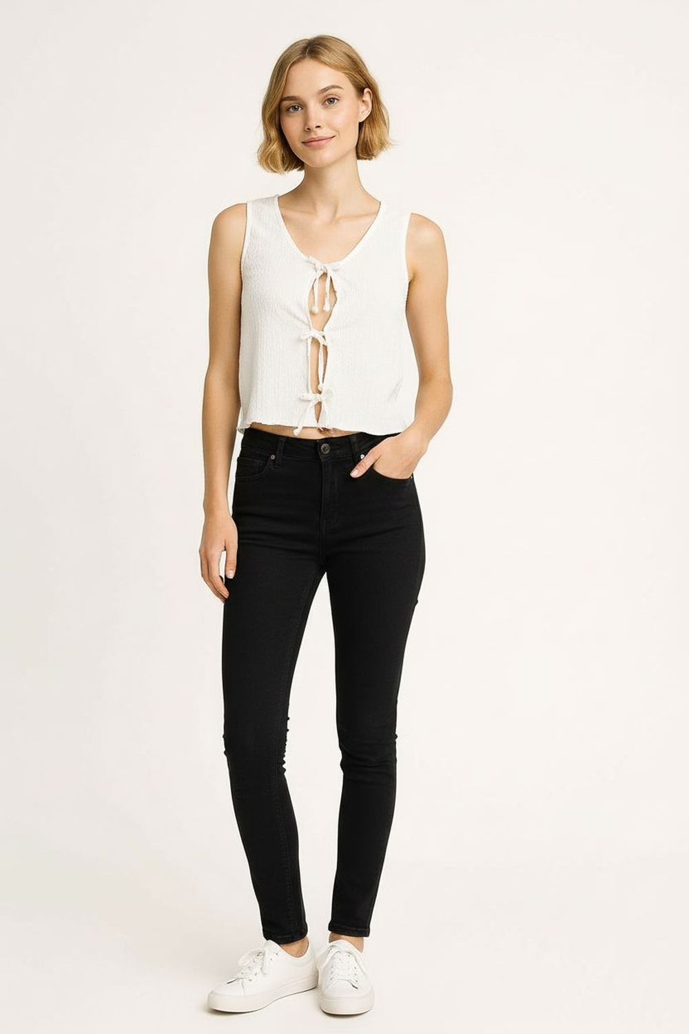 Chaleco sin mangas con estructura ajustada al torso, aberturas frontales unidas por lazos decorativos que permiten ajuste sutil, borde inferior con forma ondulada que añade detalle visual, confección ligera con textura suave al tacto para comodidad continua