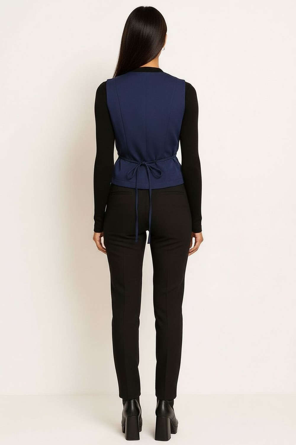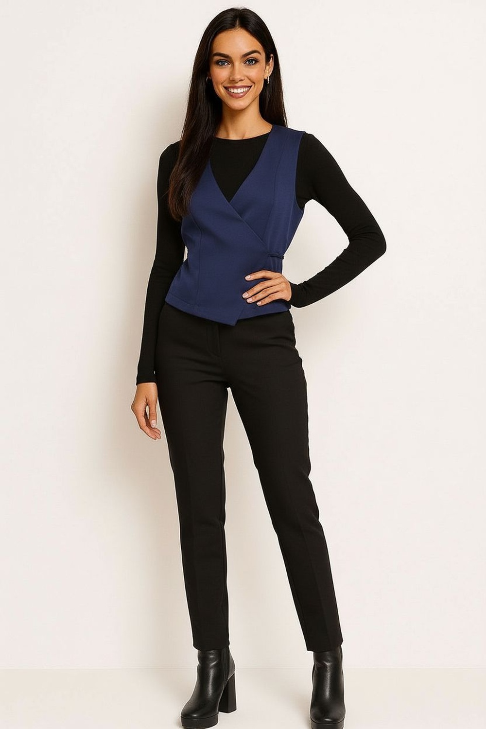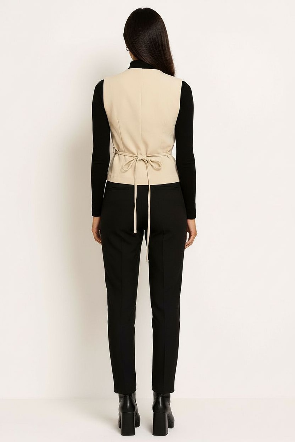 Chaleco sin mangas con corte estructurado que define la silueta, escote en V pronunciado que estiliza la parte superior, diseño cruzado al frente con lazo lateral ajustable que permite adaptar el fit, pinzas delanteras que aportan mejor caída y forma, confección firme con acabado limpio que brinda presencia y comodidad en cada uso