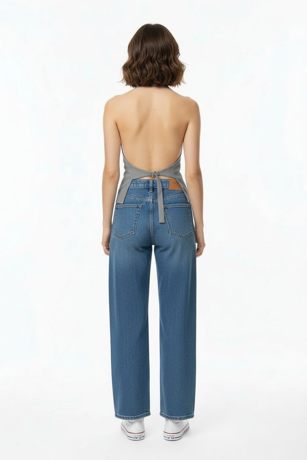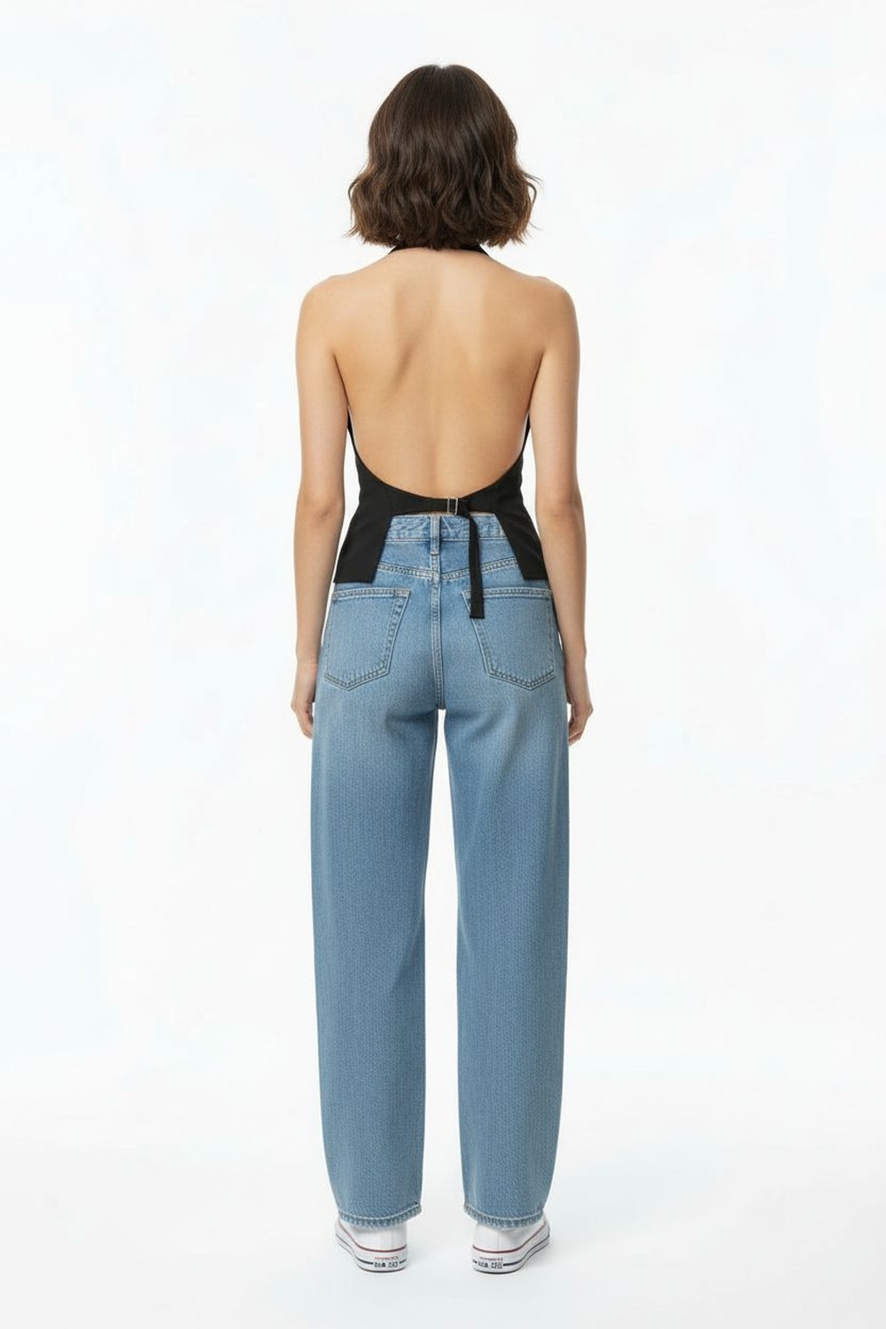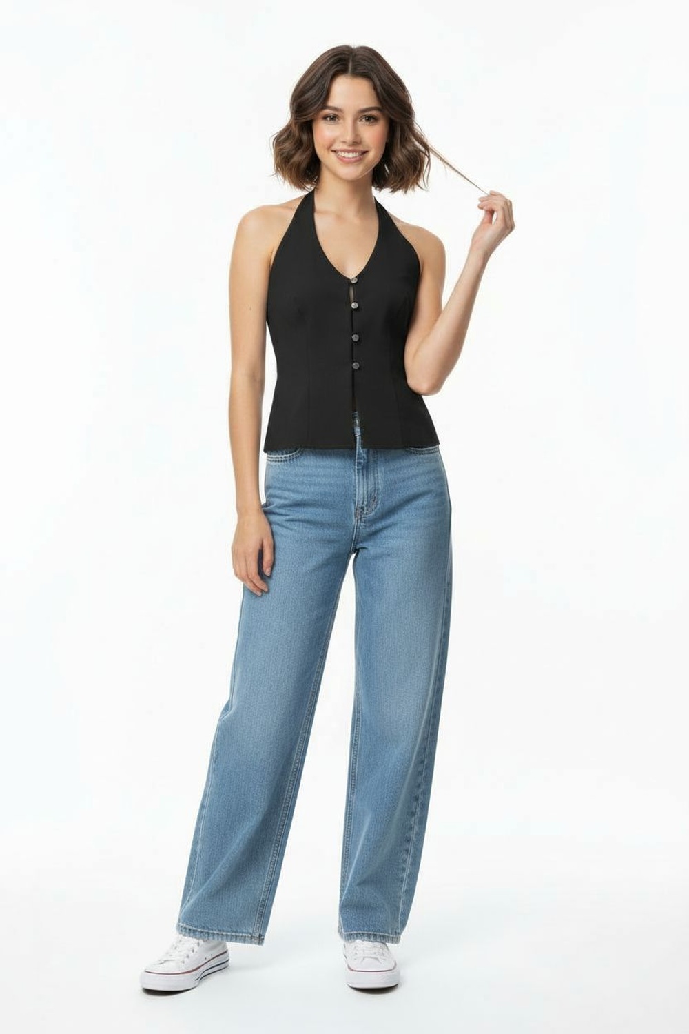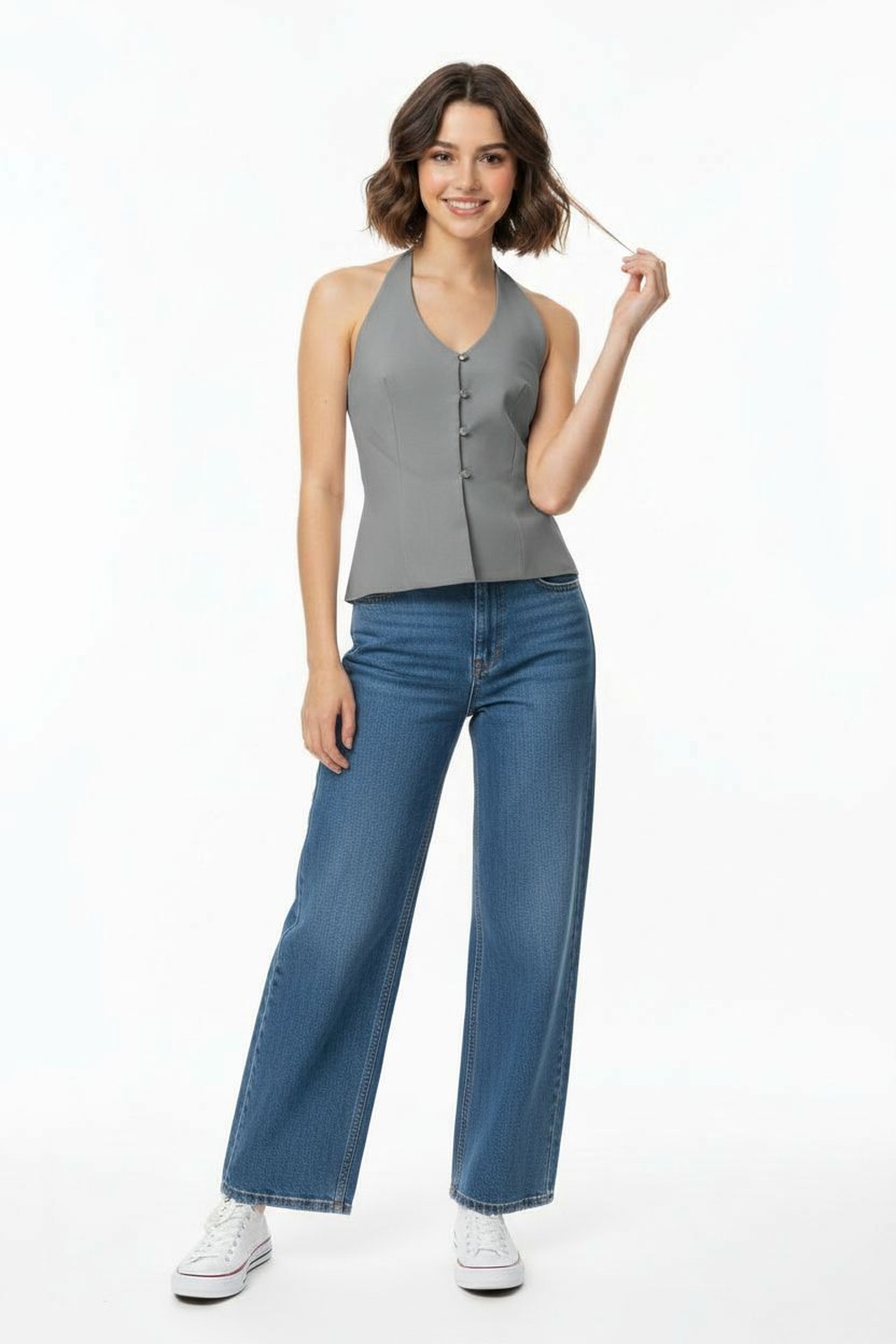 Chaleco con escote halter, cierre frontal con botones, estructura entallada, espalda descubierta con ajuste posterior, acabado firme, largo a la cintura