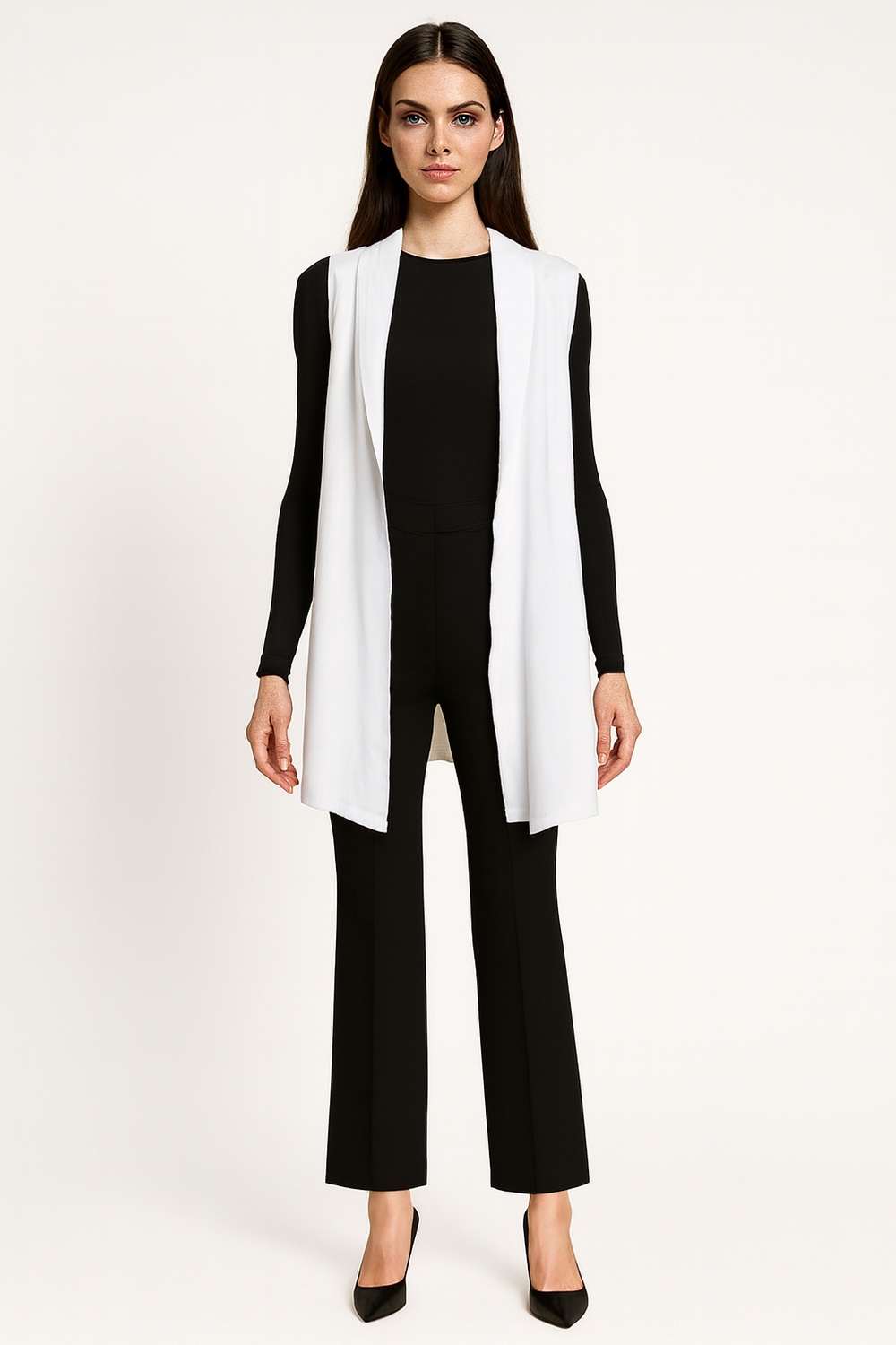 Chaleco largo abierto con solapa ancha de caída fluida que aporta movimiento y presencia, silueta alargada que estiliza la figura, cualquier outfit con un toque moderno, profesional y formal sin esfuerzo