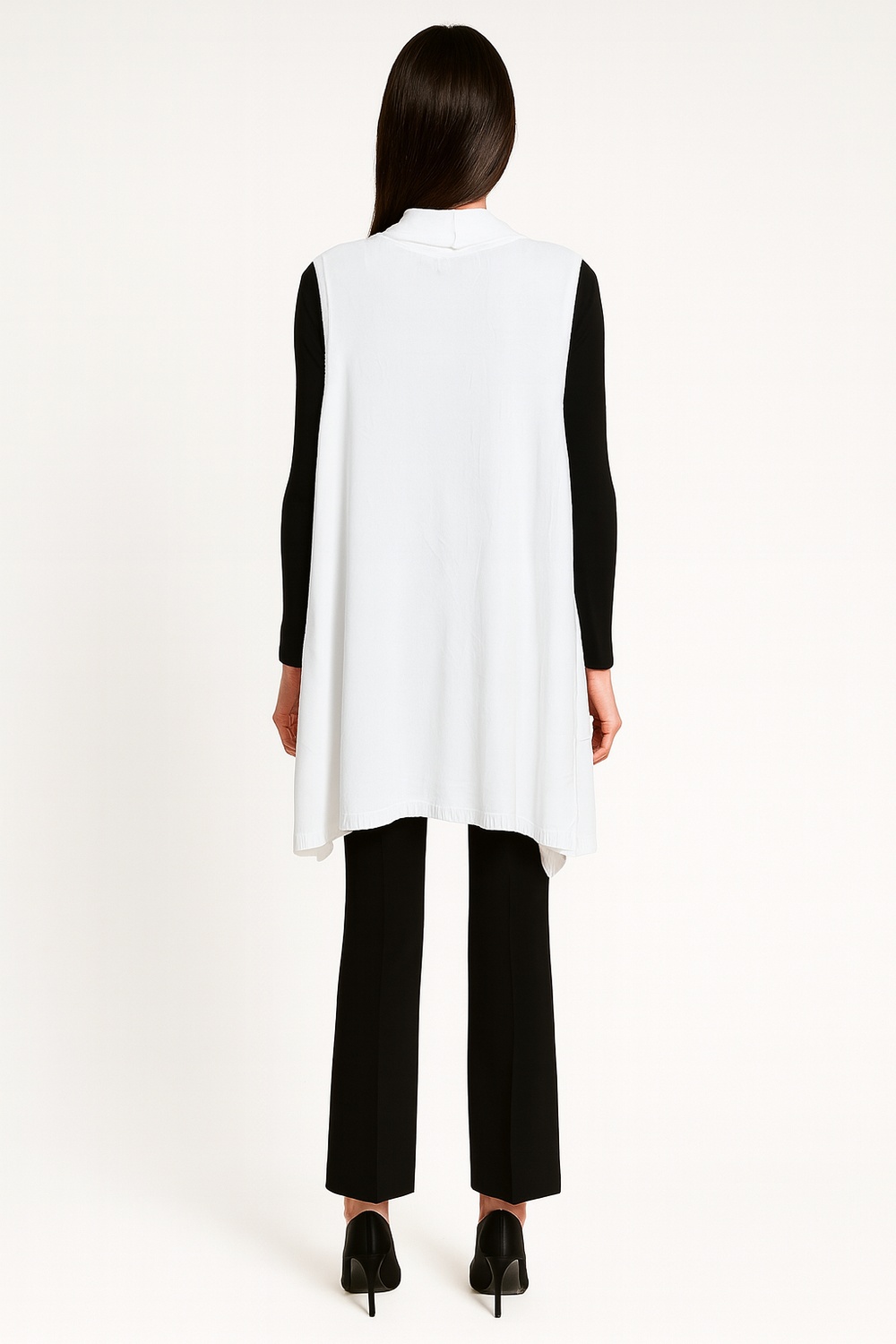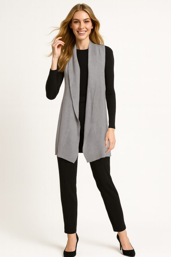 Chaleco largo sin mangas con solapas anchas que aportan fluidez al diseño, confección en tejido ligero de textura suave que brinda comodidad, corte abierto al frente que permite libertad de movimiento, largo extendido que estiliza la figura, ideal para complementar looks casuales o de oficina