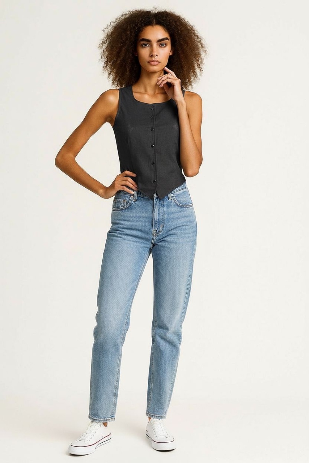 Chaleco sin mangas con cuello redondo y botonadura frontal funcional, corte recto que aporta estructura y limpieza visual, confección en material tipo lino con textura natural y acabado ligero