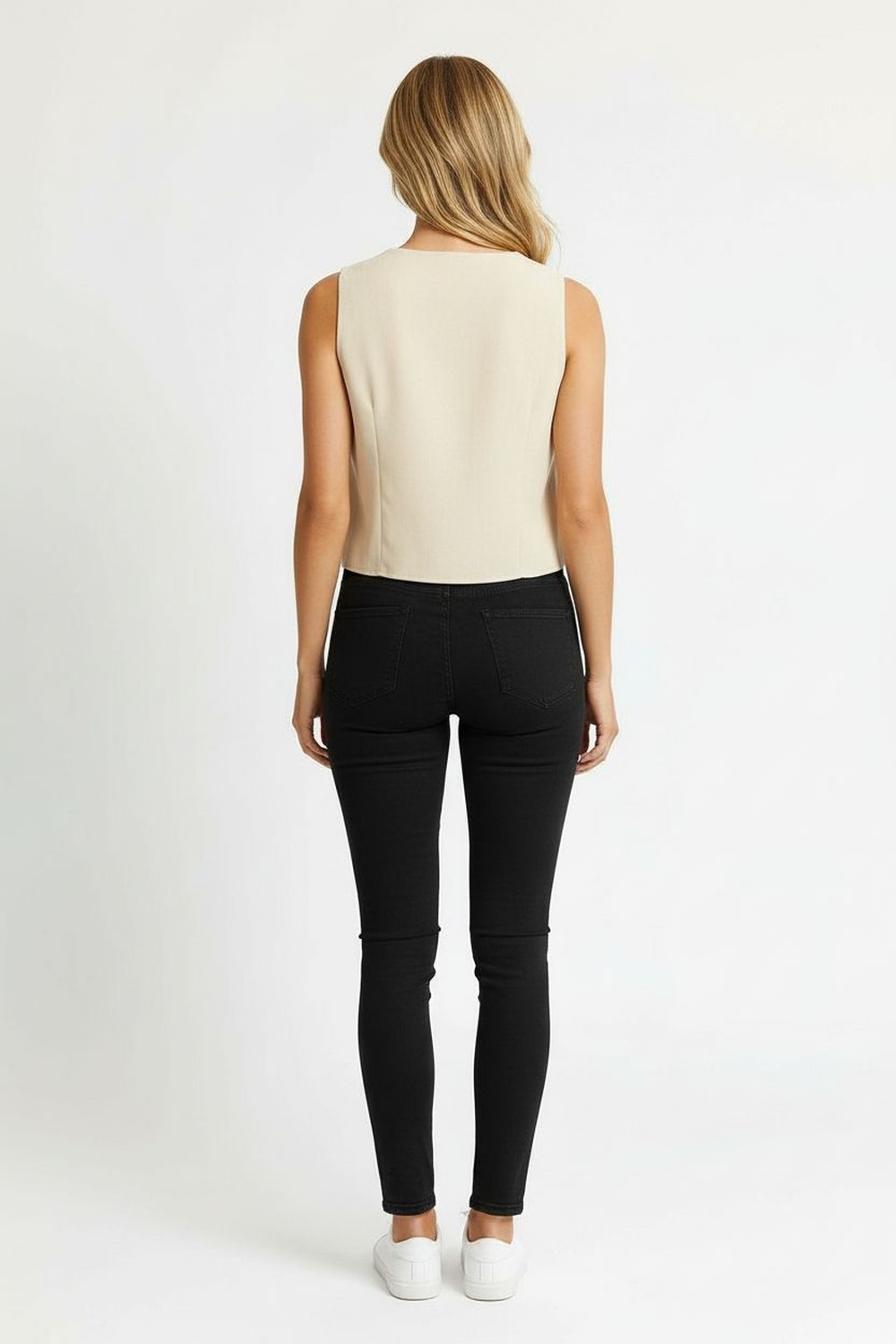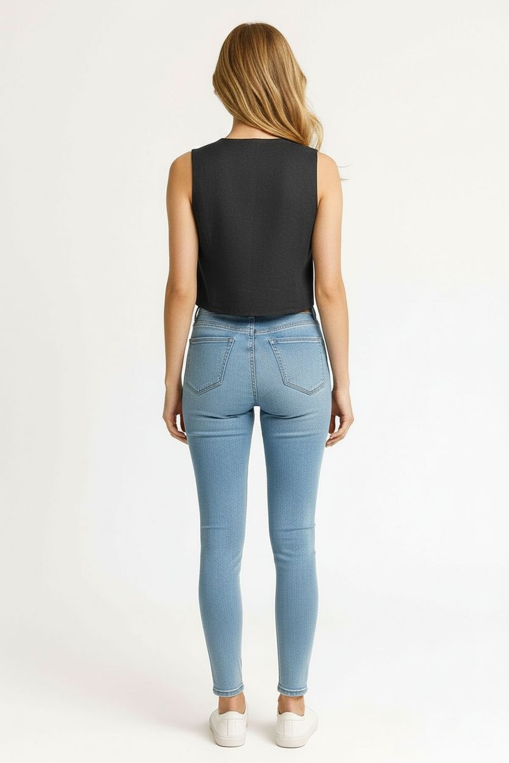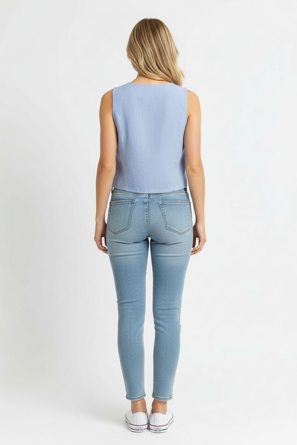 Chaleco de lino, escote en V, cierre frontal con amarres, corte recto, estructura ligera, ajuste cómodo, sin mangas