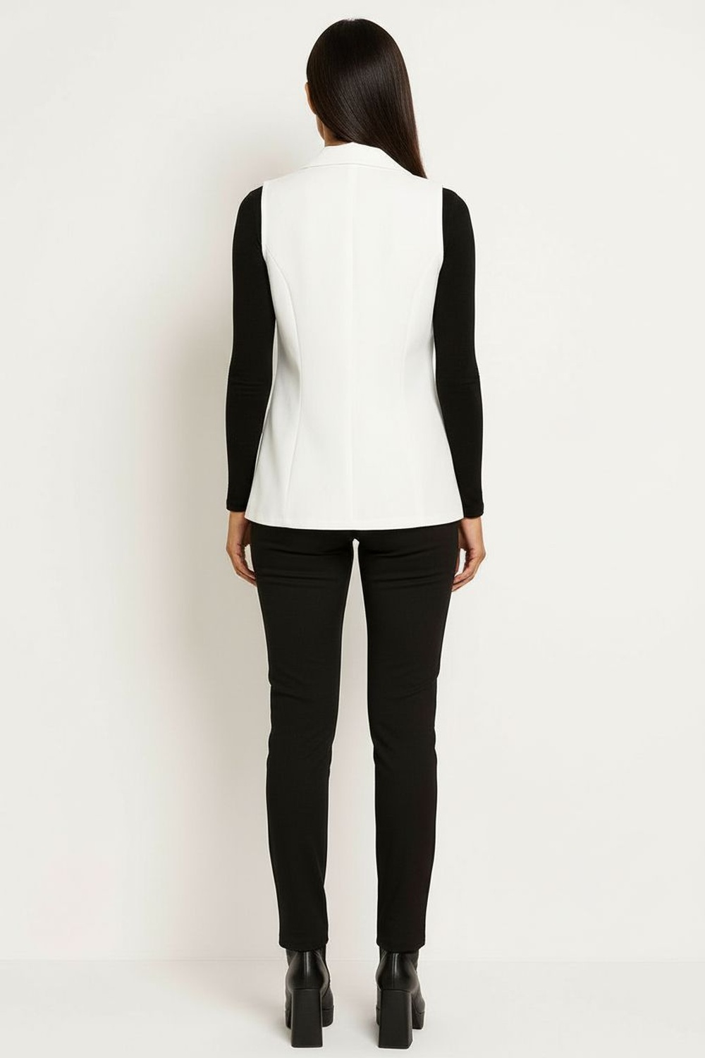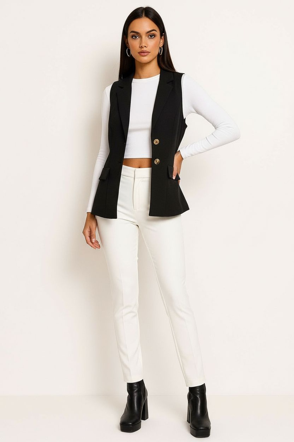 Chaleco tipo sastre con solapa estructurada y escote en V que estiliza el torso, cierre frontal con botones que aporta ajuste preciso, corte entallado con pinzas que define la cintura, bolsillos de solapa funcionales que suman detalle práctico, confección en tela de cuerpo firme con acabado limpio y elegante