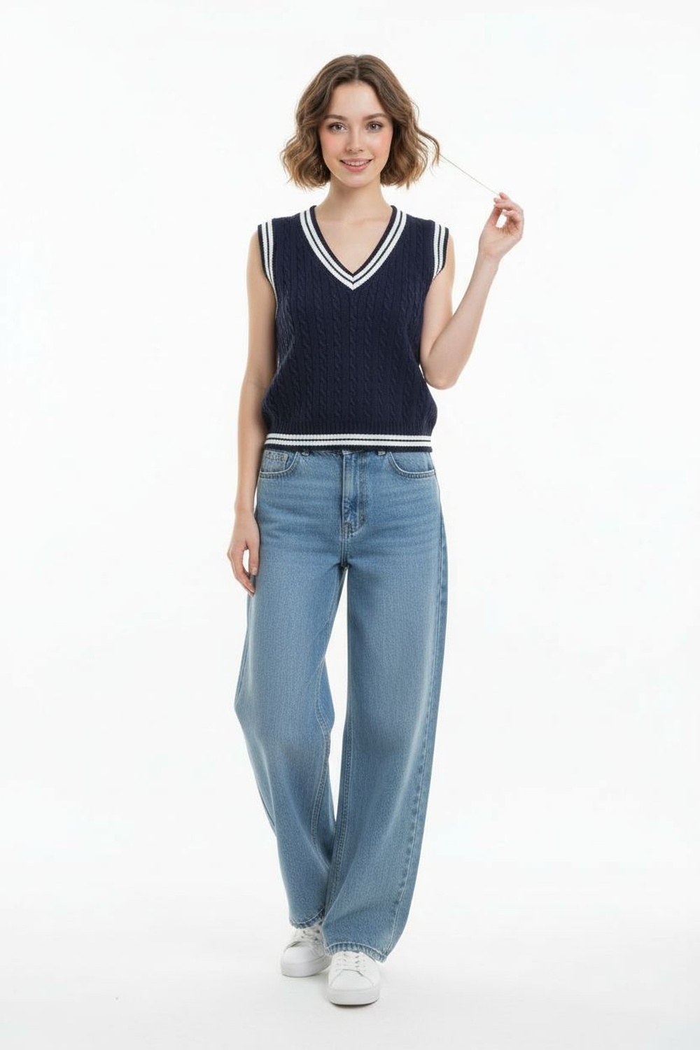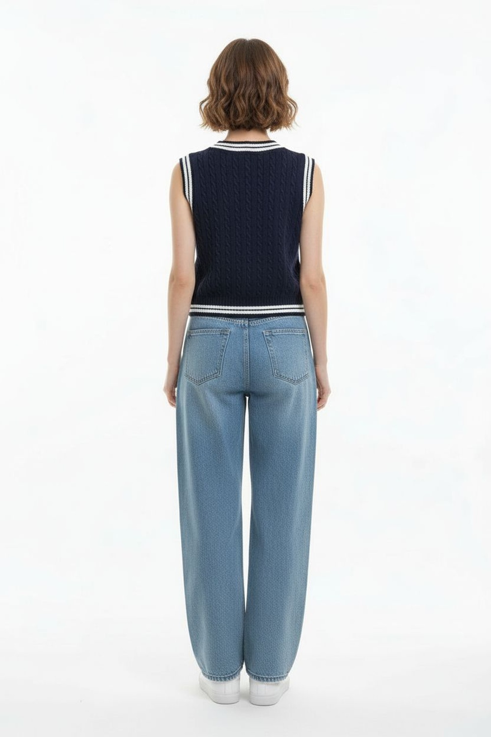Chaleco tejido sin mangas con escote en V, ajuste al cuerpo, terminaciones en contraste, acabado acanalado, confección en tejido estructurado, caída recta