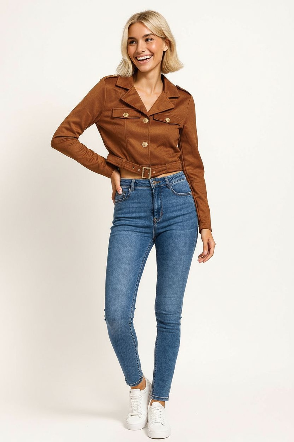 Chamarra tipo biker con solapa amplia que aporta actitud moderna, cierre frontal metálico que brinda ajuste firme, bolsillos decorativos que complementan el diseño, cinturón integrado que permite definir el contorno, confección en tejido suave de apariencia robusta que mantiene estructura sin sacrificar comodidad