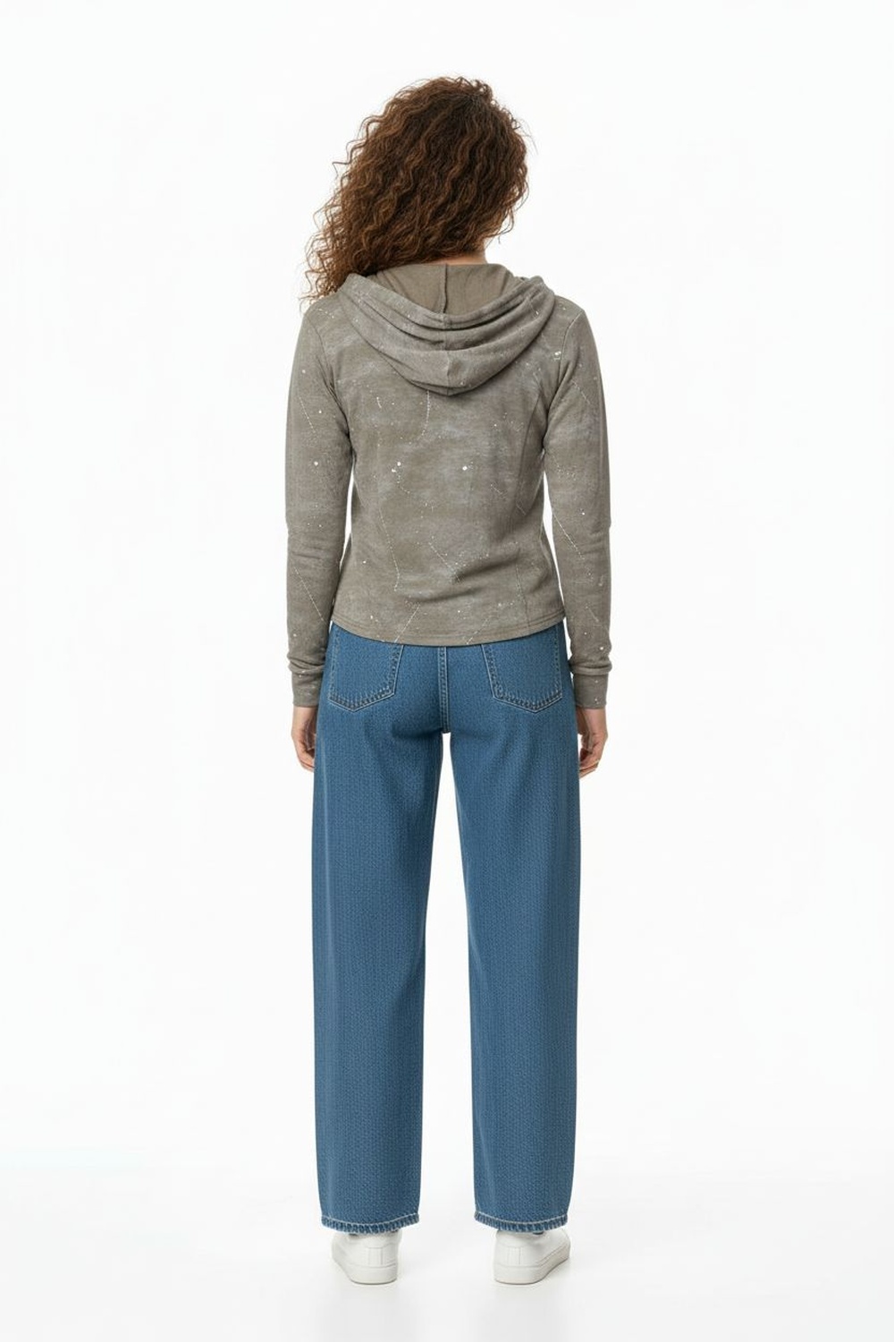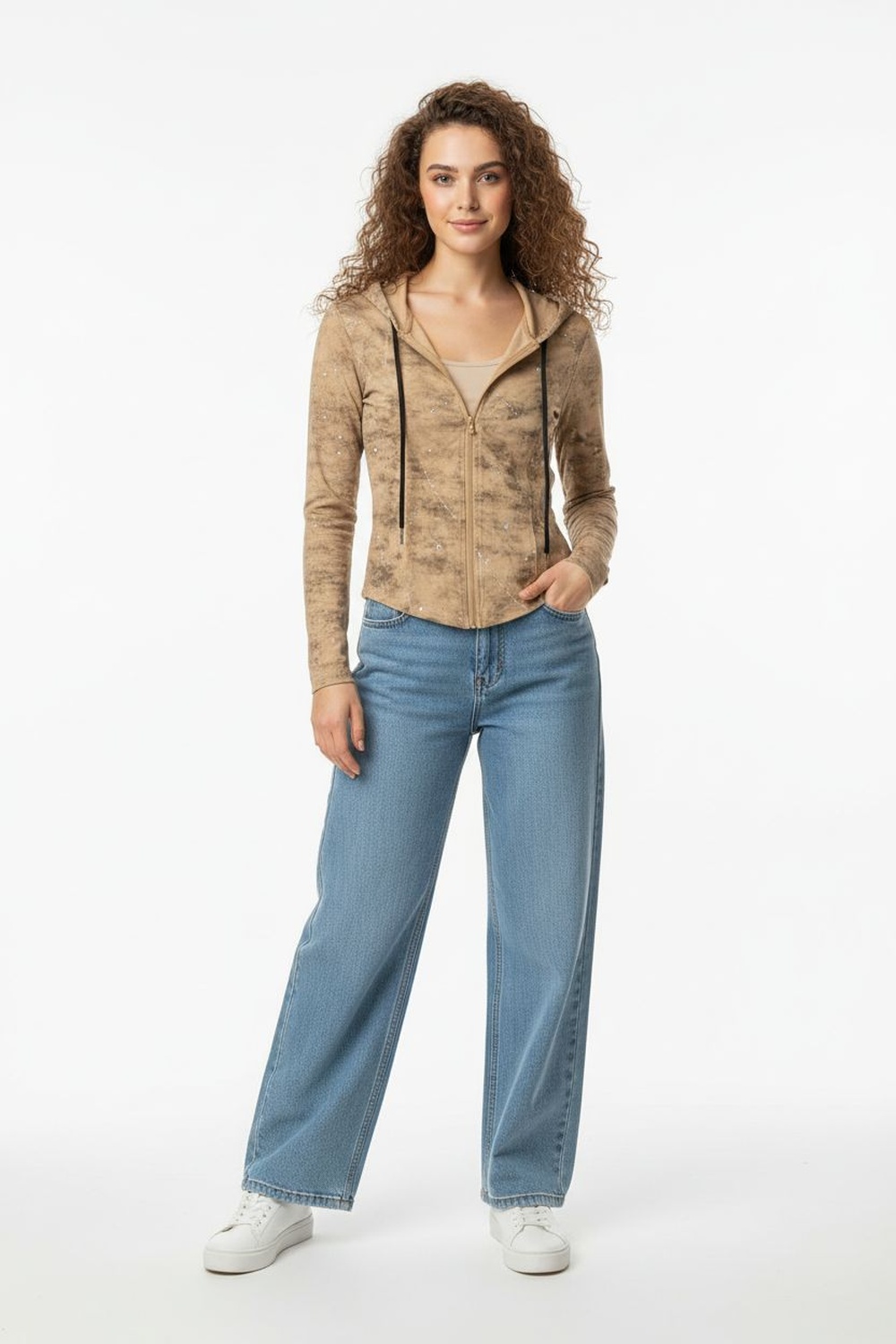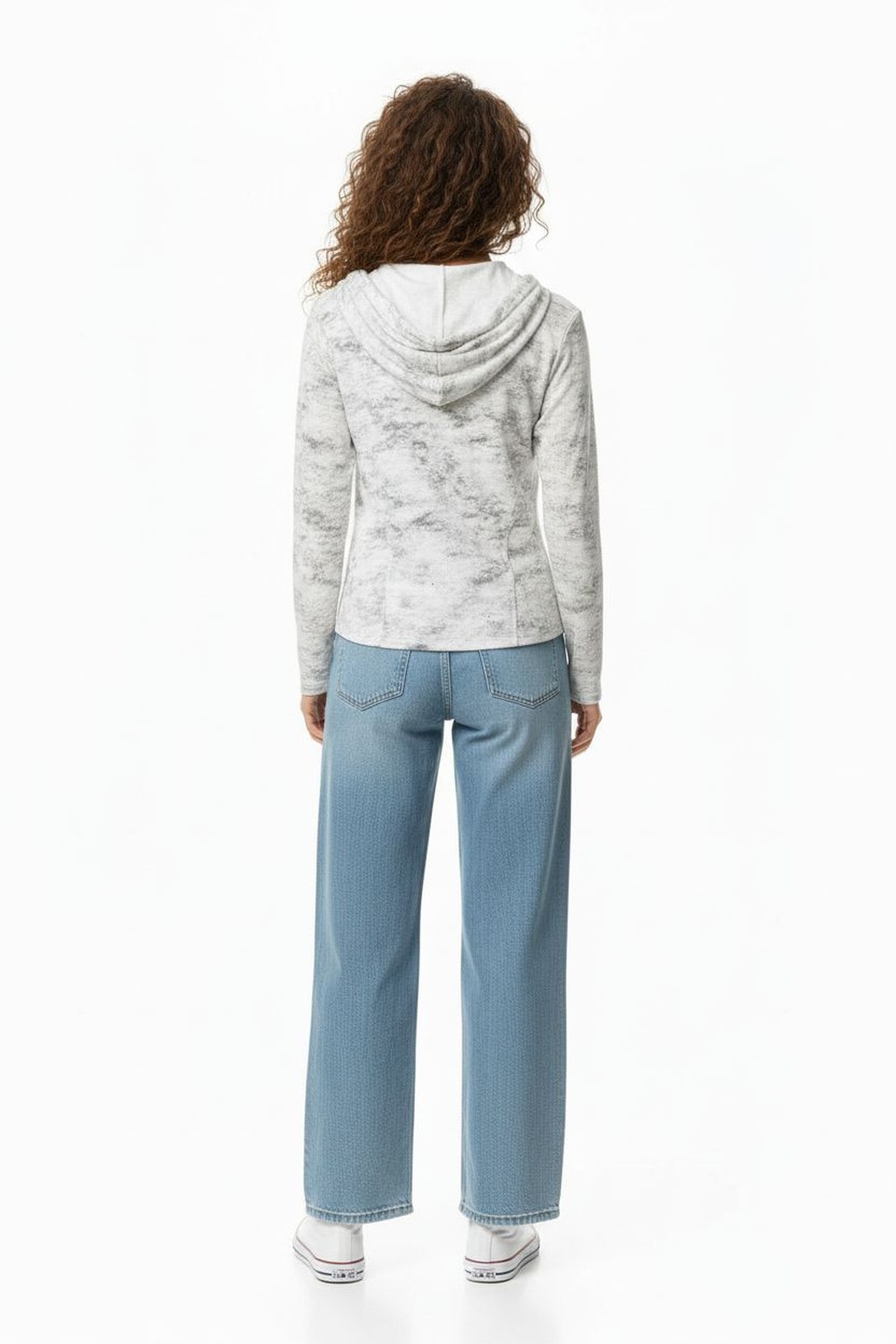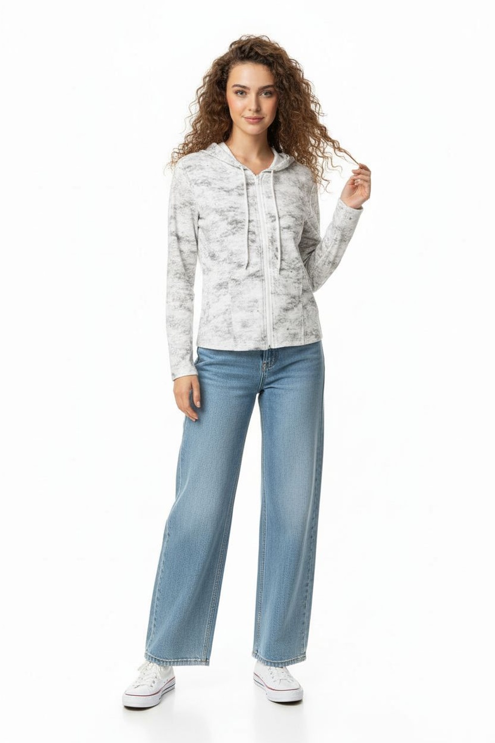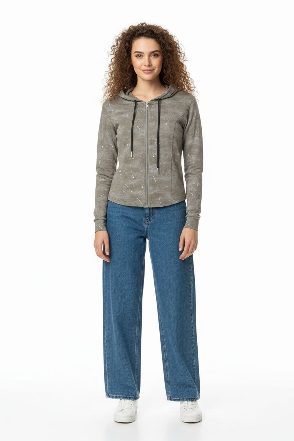 Chamarra con capucha ajustable mediante cordones, cierre frontal completo, manga larga con ajuste al cuerpo, bolsillos laterales funcionales y acabado suave al tacto