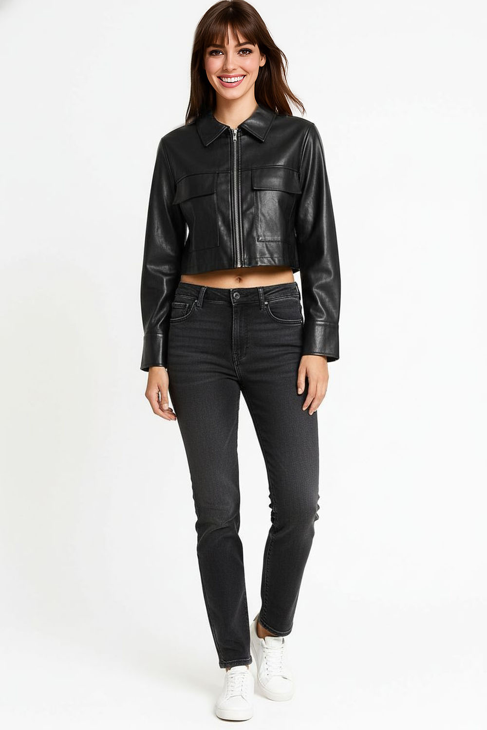 Chamarra corta con cuello alto y cierre al frente, diseño entallado que realza la figura, confección en tela suave de acabado elástico que brinda comodidad y libertad de movimiento, mangas largas y dobladillo recto que aportan ajuste preciso