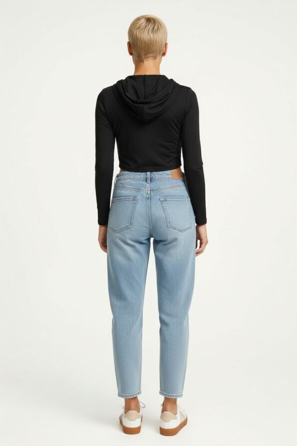 Chamarra corta de mezclilla con terminación deshilada en el borde inferior que aporta un look moderno y juvenil, cuello camisero estructurado que realza el diseño clásico, cierre frontal con botones metálicos que aseguran resistencia y durabilidad, bolsillos frontales de solapa con detalles de tiras brillantes que añaden un toque llamativo y sofisticado, manga larga con puños ajustables que permiten mayor comodidad