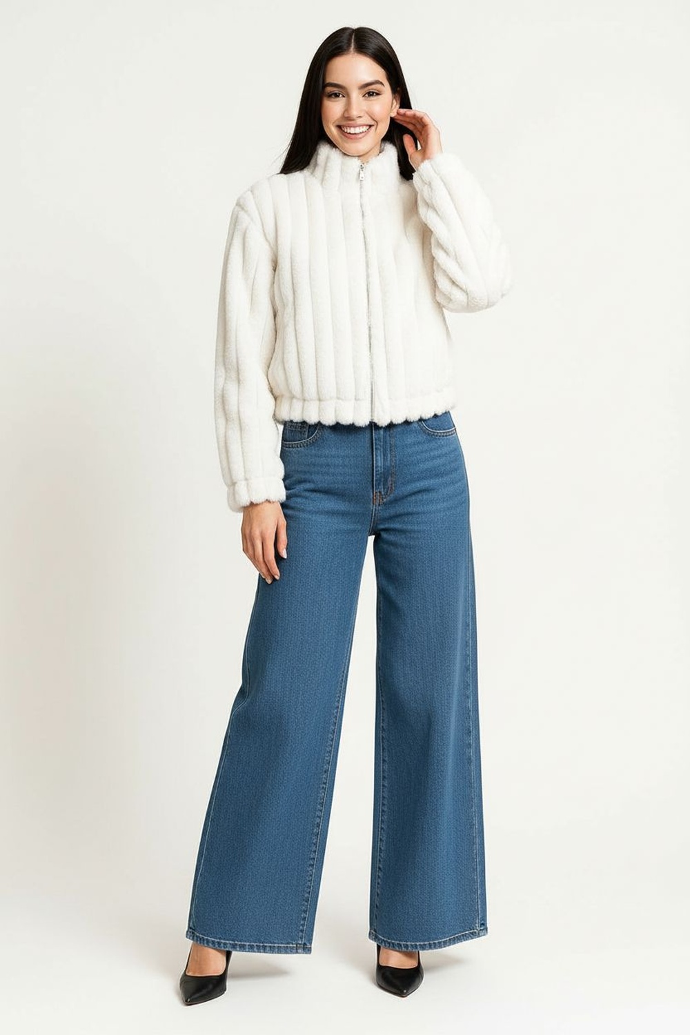 Chamarra de peluche con textura suave y detalle en rayas que aporta un look moderno, cierre metálico frontal que brinda practicidad, cuello alto que ofrece mayor cobertura, puños y cintura con acabado elástico que aseguran mejor ajuste, prenda cálida y versátil ideal para outfits casuales de temporada