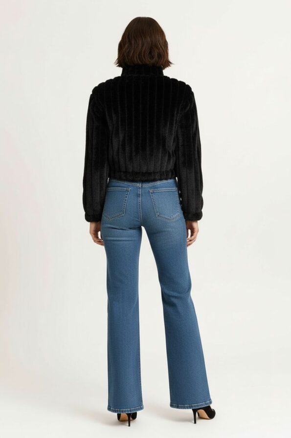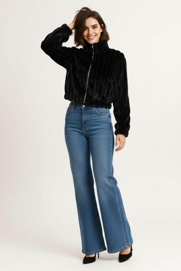 Chamarra corta con cuello alto y cierre frontal, confeccionada en tejido suave de textura aterciopelada que aporta calidez y confort, diseño estructurado con ajuste en cintura que realza la figura, acabado interno reforzado que brinda durabilidad y comodidad en cada uso, manga larga con puño elástico que mejora el ajuste y protege del frío
