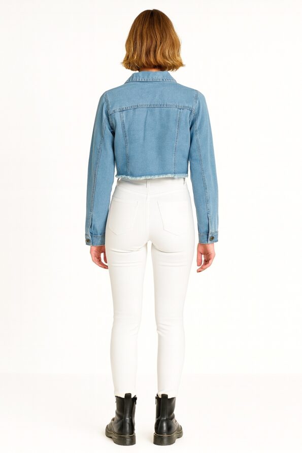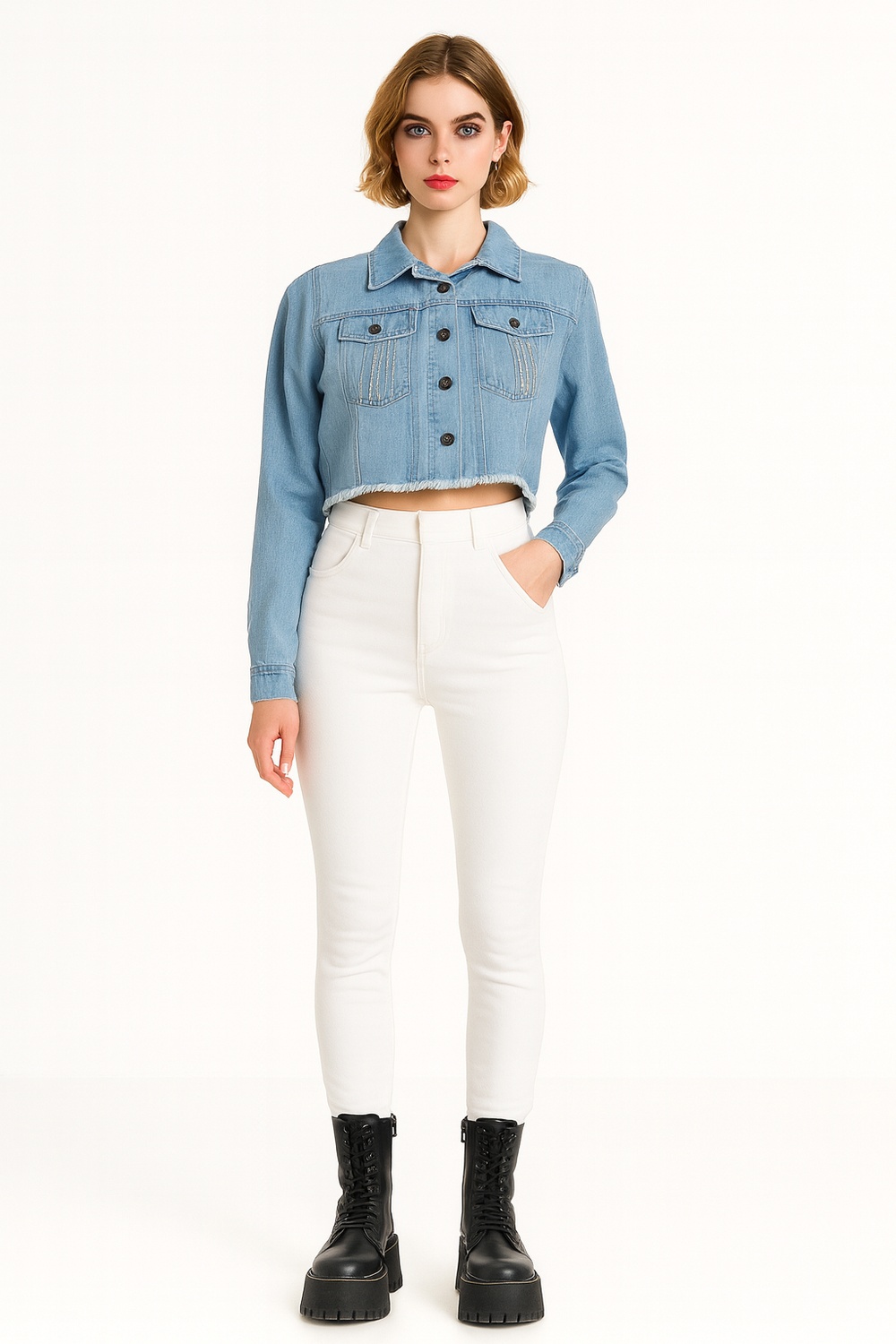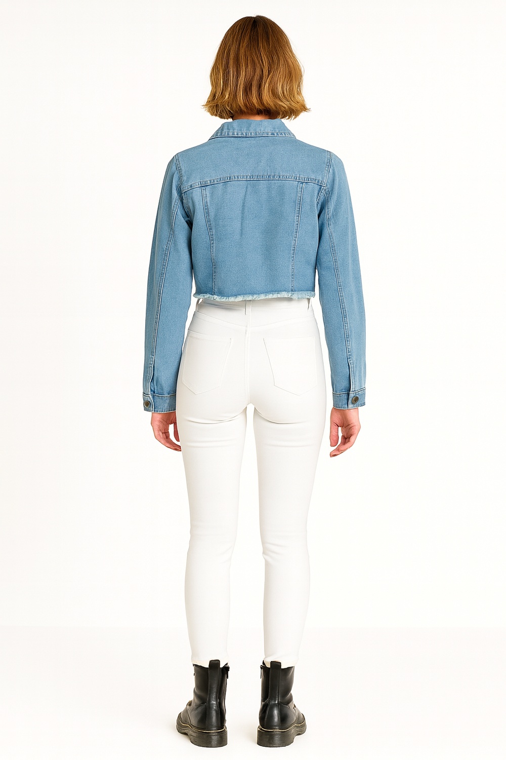 Chamarra corta de mezclilla con terminación deshilada en el borde inferior que aporta un look moderno y juvenil, cuello camisero estructurado que realza el diseño clásico, cierre frontal con botones metálicos que aseguran resistencia y durabilidad, bolsillos frontales de solapa con detalles de tiras brillantes que añaden un toque llamativo y sofisticado, manga larga con puños ajustables que permiten mayor comodidad