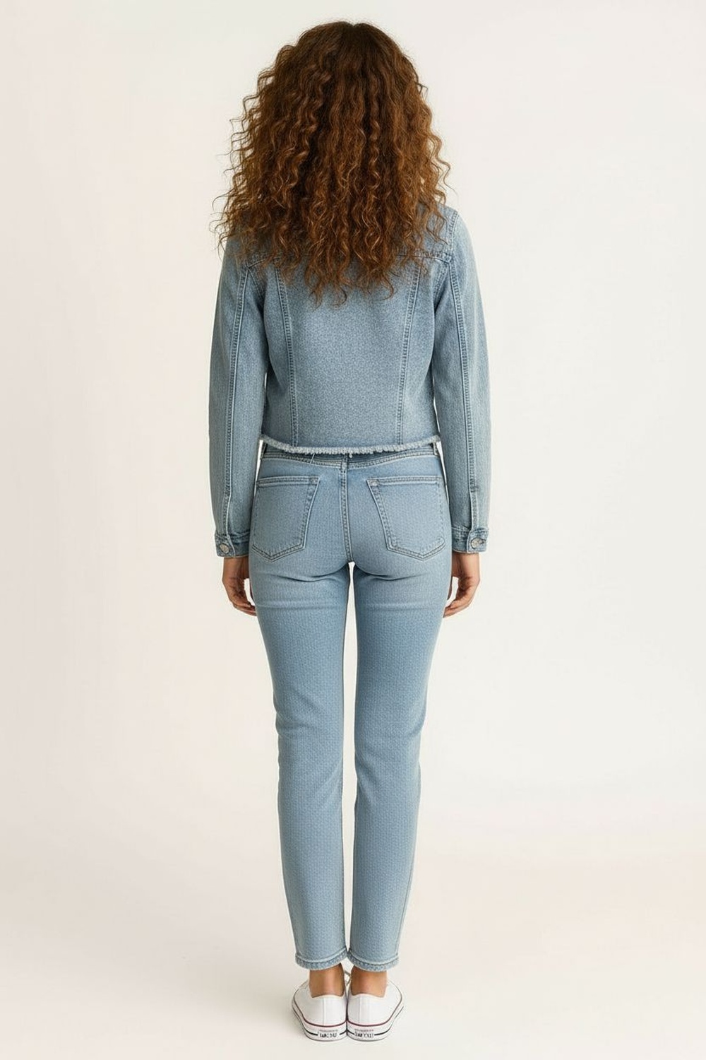 Chamarra de mezclilla con corte corto que define la cintura y resalta la figura, cierre de botones al frente que permite un ajuste práctico y moderno, bolsillos decorativos que añaden estilo funcional, terminado deshilado que aporta un toque juvenil y contemporáneo