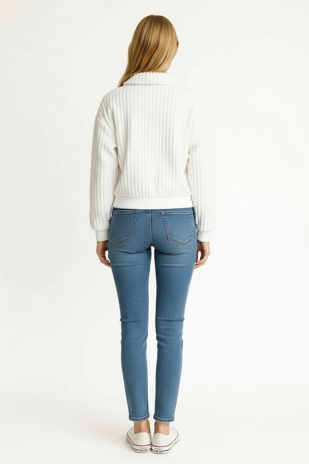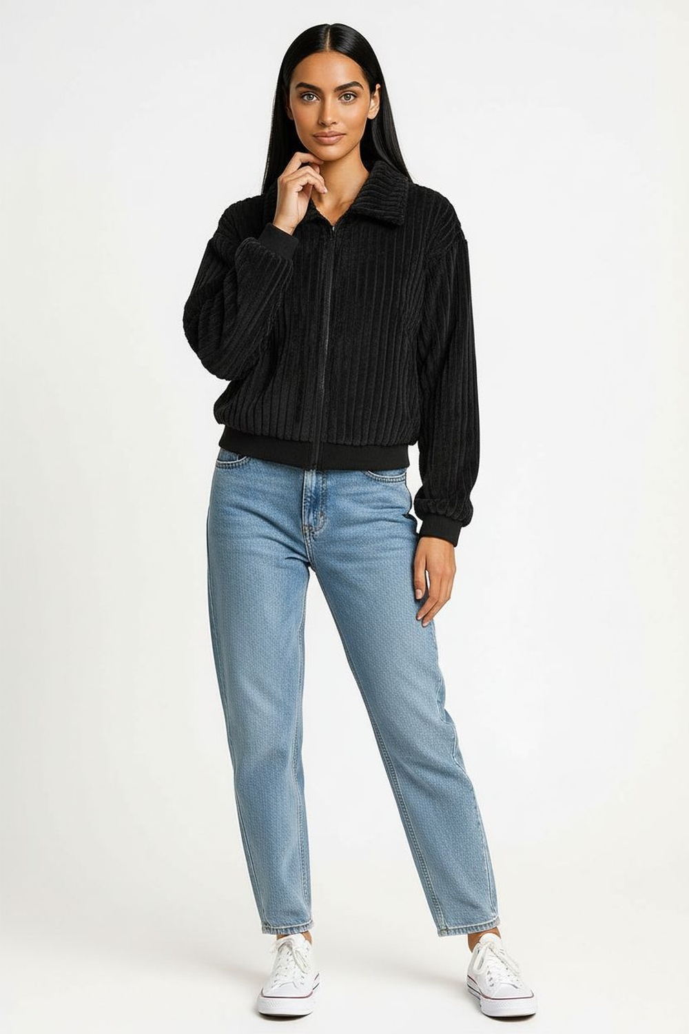 Chamarra confeccionada en felpa acanalada con tacto aterciopelado, cuello camisero que aporta estructura al diseño, cierre frontal de cremallera y cintura elástica que se ajusta cómodamente al cuerpo, manga larga con terminación ajustada para mayor abrigo