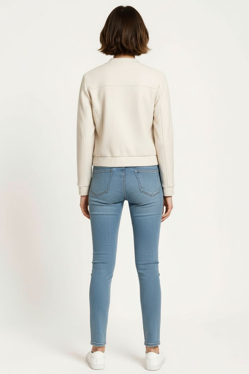 Chamarra de tejido rib con cierre al frente que brinda practicidad y ajuste seguro, cuello y puños en material suave que añaden contraste y textura elegante, corte corto que define la cintura y favorece la figura, confección ligera y elástica que ofrece confort y movilidad durante el día