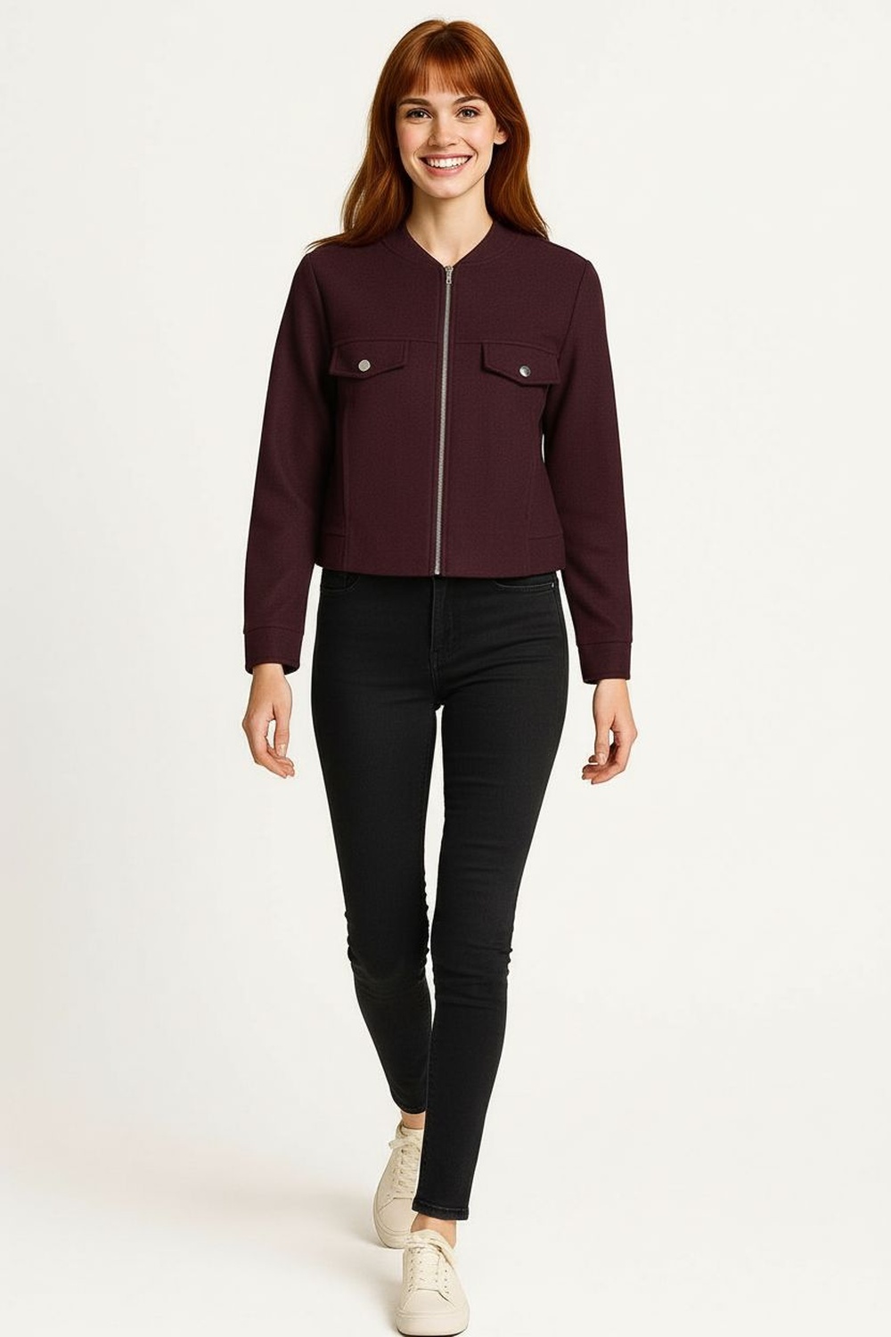 Chamarra confeccionada en paño suave con cierre metálico al frente y bolsillos con solapa, estructura recta con costuras definidas que brindan un acabado limpio, cuello redondo y puños reforzados para mayor ajuste