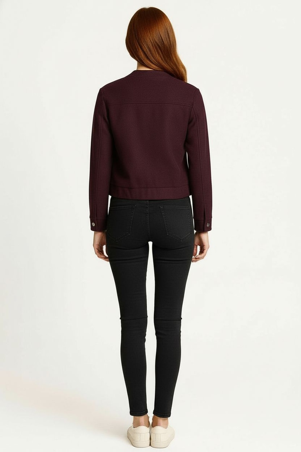 Chaqueta corta de corte crop con cuello camisero que aporta estructura moderna, bolsillos frontales con tapa que brindan detalle funcional y estético, cierre con botones que aseguran ajuste práctico y cómodo, manga larga con puño ajustado que ofrece versatilidad y estilo, confección en tela resistente de acabado pulido que mantiene su forma, ideal para complementar looks casuales y modernos de temporada