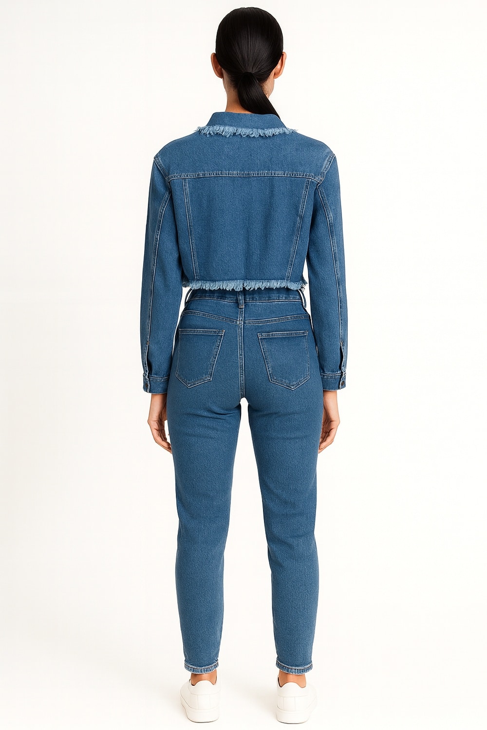 Chamarra corta con cuello camisero y estructura definida, botonadura frontal metálica que aporta funcionalidad y ajuste, bolsillos superiores de parche con tapa que añaden soporte y diseño, pretina corta con terminado deshilado que brinda un toque moderno, mangas largas con puño ajustable para mayor comodidad
