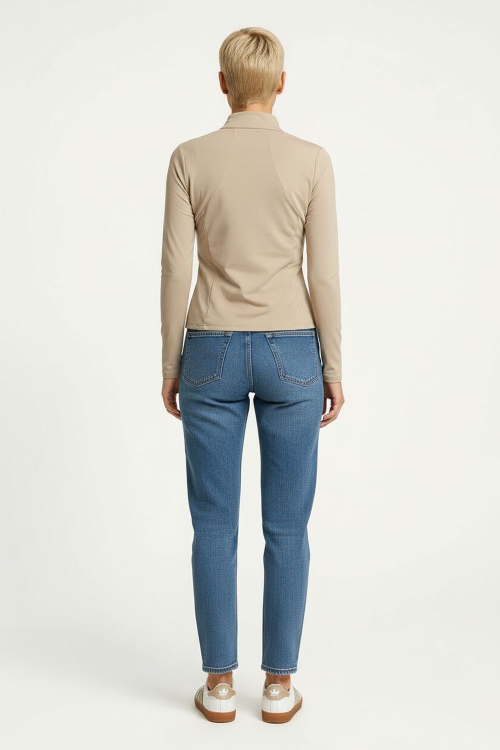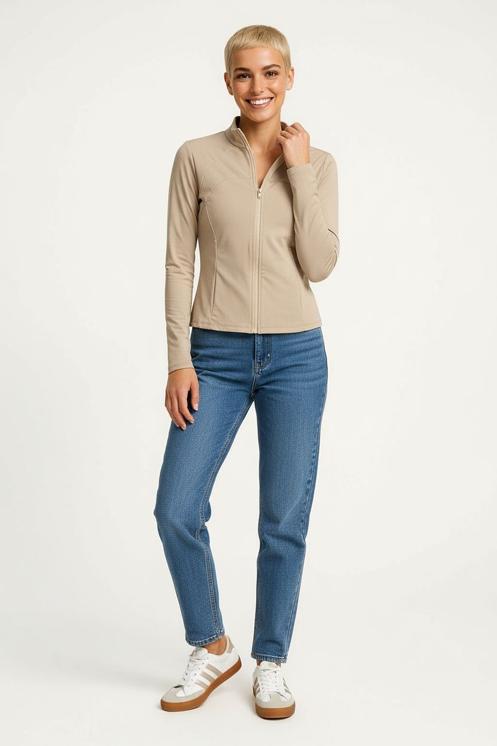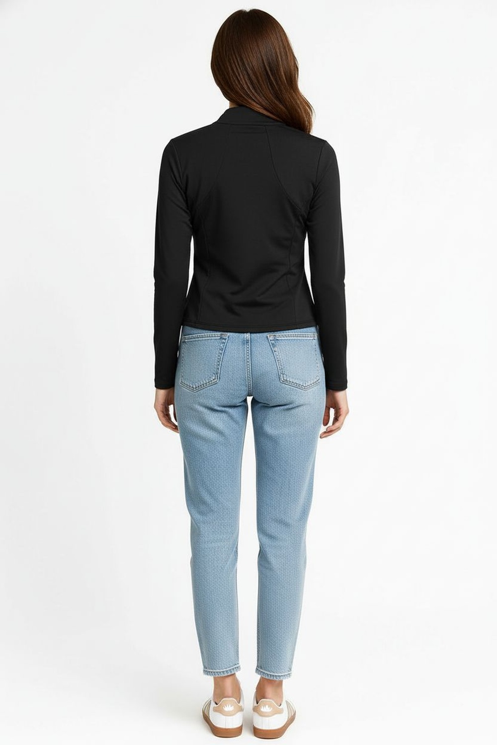 Chamarra ajustada confeccionada en tejido elástico de alta recuperación, cuello alto con cierre completo al frente que garantiza un ajuste cómodo, costuras en líneas curvas que realzan la silueta y diseño ergonómico que combina confort y estilo en una prenda funcional