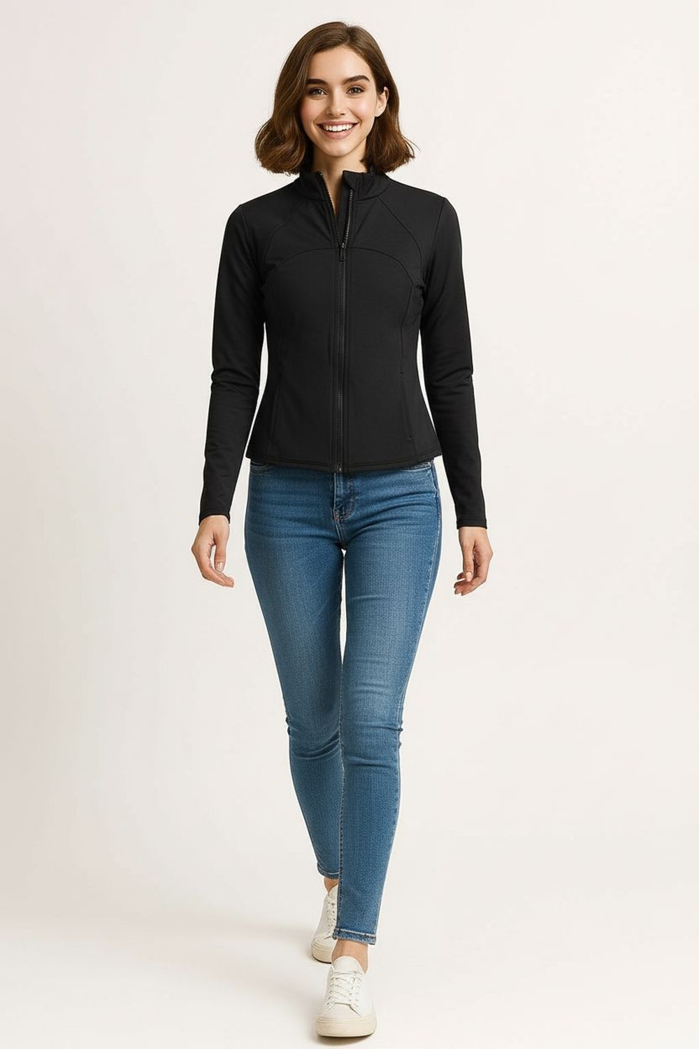 Chamarra de manga larga con cuello alto, elaborada en material flexible de tacto suave, cierre frontal continuo, detalle de pespuntes laterales que aportan definición, estructura ceñida que acompaña la silueta