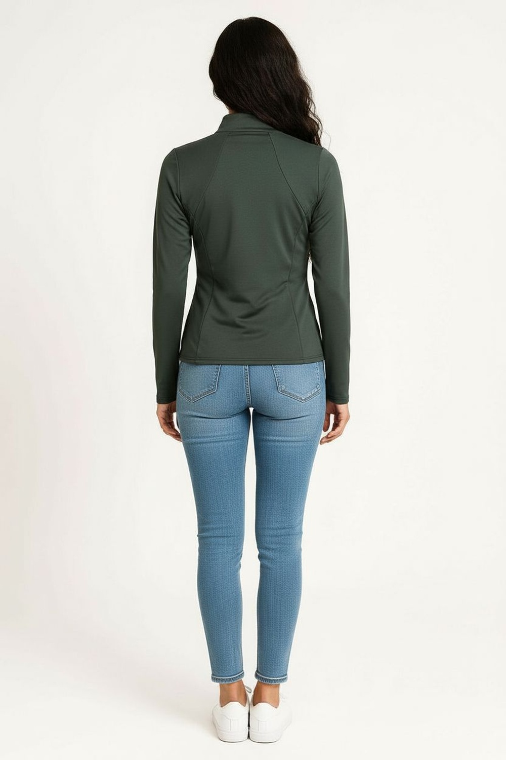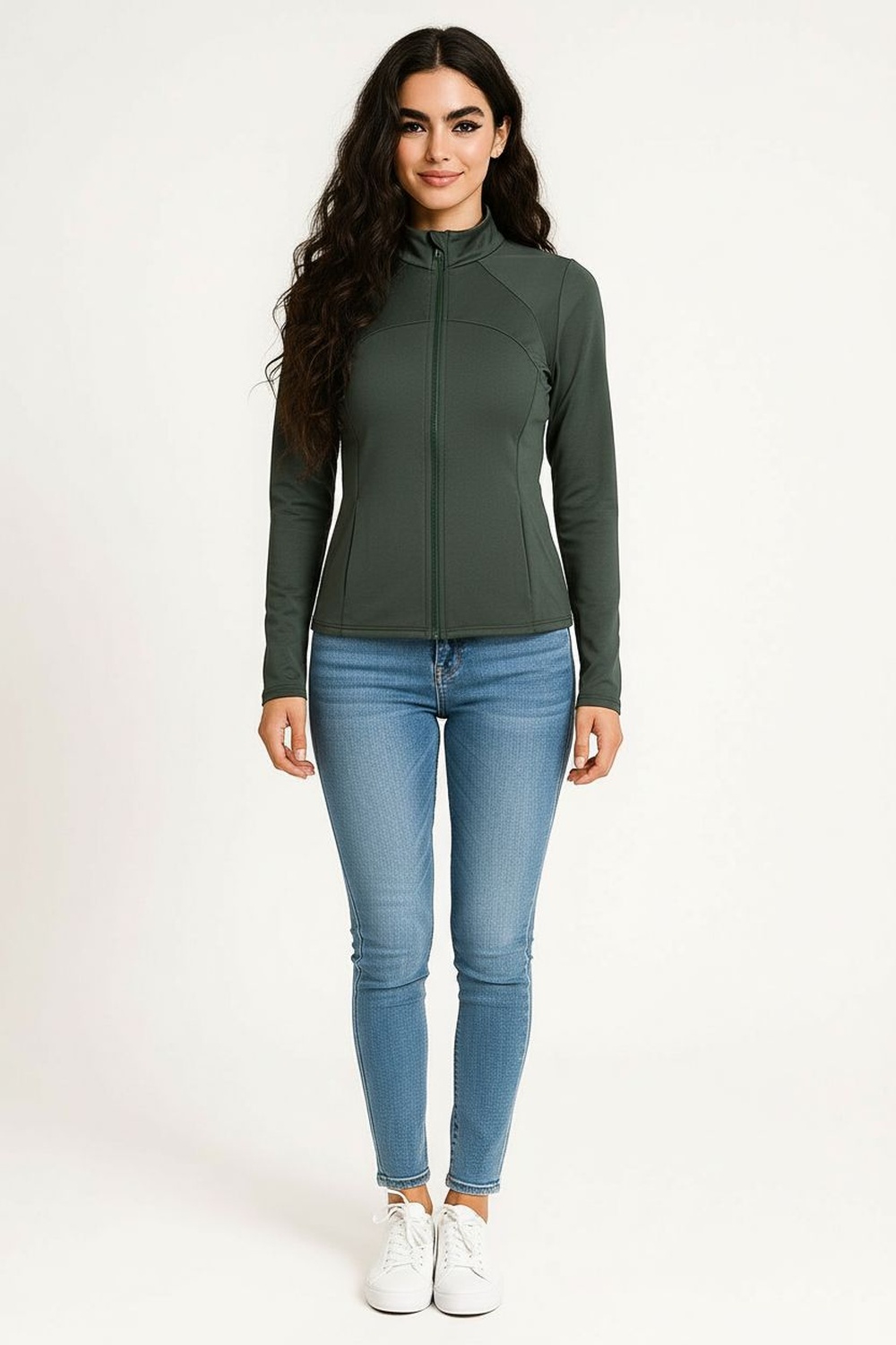 Chamarra de manga larga con cuello alto, elaborada en tejido rib de tacto suave, cierre frontal continuo, paneles que estilizan el contorno, estructura flexible que acompaña el movimiento del cuerpo