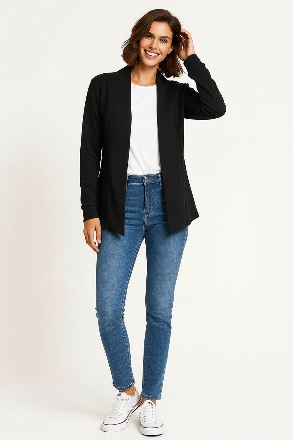 Chamarra ligera de corte recto con solapa amplia y caída fluida que aporta un toque moderno, diseño abierto al frente que permite libertad de movimiento, acabado suave al tacto que ofrece comodidad durante el uso, mangas largas con estructura que estiliza el torso, confección con costuras limpias que brindan una apariencia pulida y contemporánea