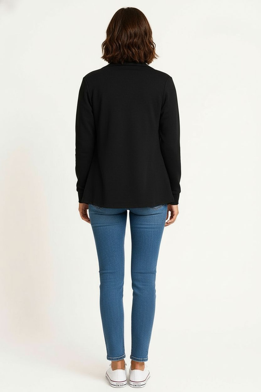 Ensamble ligero con caída en pico al frente que aporta movimiento y elegancia, hombros con detalle de charretera que añaden un toque estructurado, manga larga con ajuste cómodo que favorece la silueta, confección en tejido suave y fluido que ofrece confort y estilo versátil