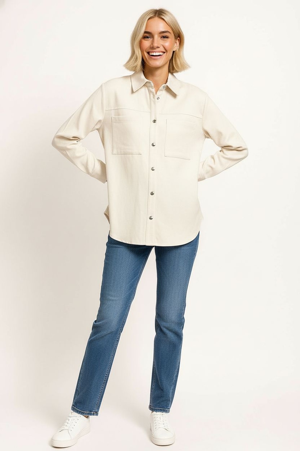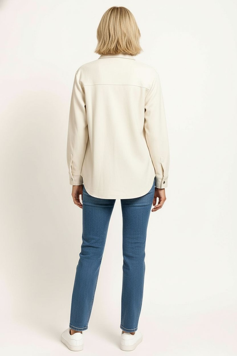 Chamarra de textura acanalada con cuello camisero amplio, cierre frontal con botones que aportan un toque clásico, corte recto que ofrece libertad de movimiento, terminaciones suaves en puños y dobladillo que aseguran confort y durabilidad