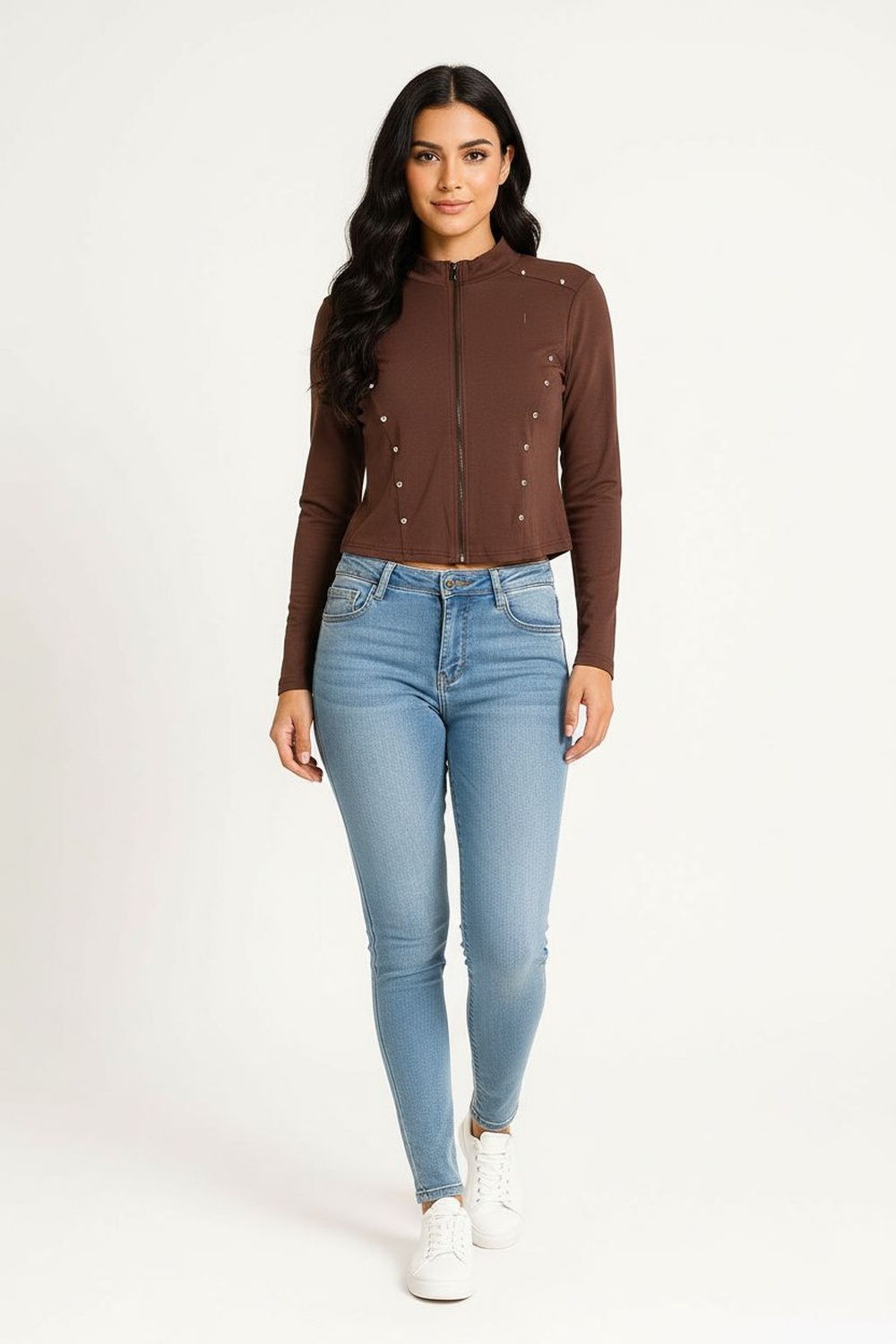 Chamarra de manga larga con cuello alto, elaborada en tejido de estructura firme, cierre frontal funcional, aplicación de remaches distribuidos que aportan textura, corte ajustado que define la silueta sin limitar movilidad