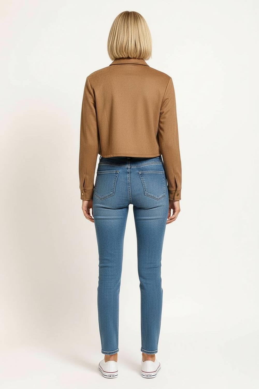 Chamarra corta con botón frontal que aporta sujeción precisa, cuello clásico que estructura la parte superior, bolsos amplios al frente que ofrecen funcionalidad, confección tipo gamuza que genera textura uniforme, dobladillo recto que mantiene un ajuste pulido y contemporáneo