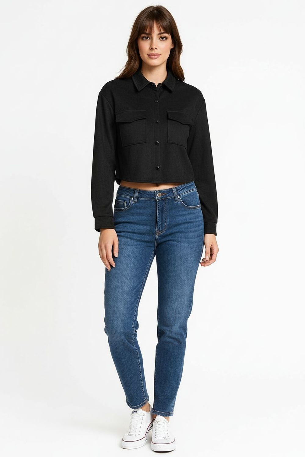 Chaqueta corta con cuello camisero y cierre frontal de botones metálicos, diseño estructurado que combina textura suave con aplicaciones al tono, bolsillos superiores con tapa que aportan funcionalidad y estilo, confección en tejido firme que brinda comodidad y durabilidad, dobladillo recto que acentúa la silueta y aporta un acabado moderno