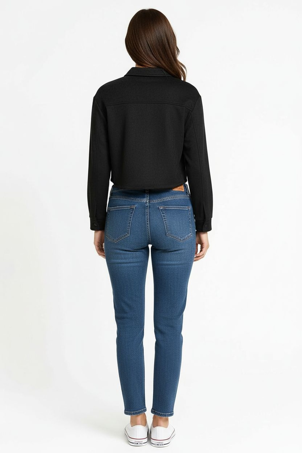 Chamarra corta con cuello camisero y estructura definida, botonadura frontal metálica que aporta funcionalidad y ajuste, bolsillos superiores de parche con tapa que añaden soporte y diseño, pretina corta con terminado deshilado que brinda un toque moderno, mangas largas con puño ajustable para mayor comodidad