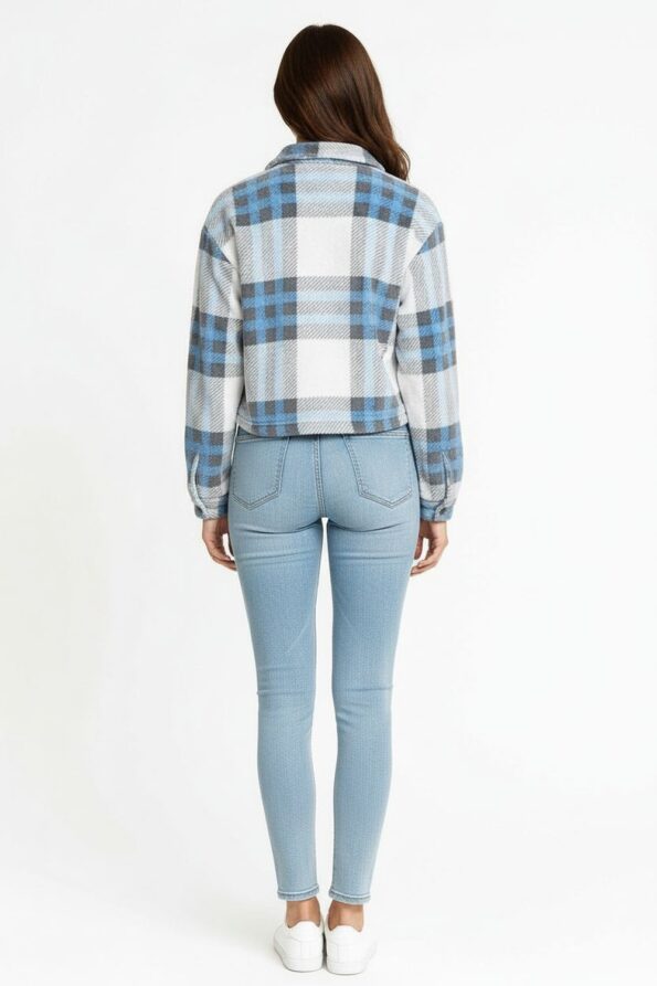 Chamarra corta de manga larga con cuello camisero, confeccionada en tejido tipo peluche con textura cálida y suave, diseño de cuadros que aporta un toque moderno y casual, cierre frontal con botones metálicos, bolsas frontales con solapa que ofrecen practicidad y estilo, terminaciones limpias que realzan la confección
