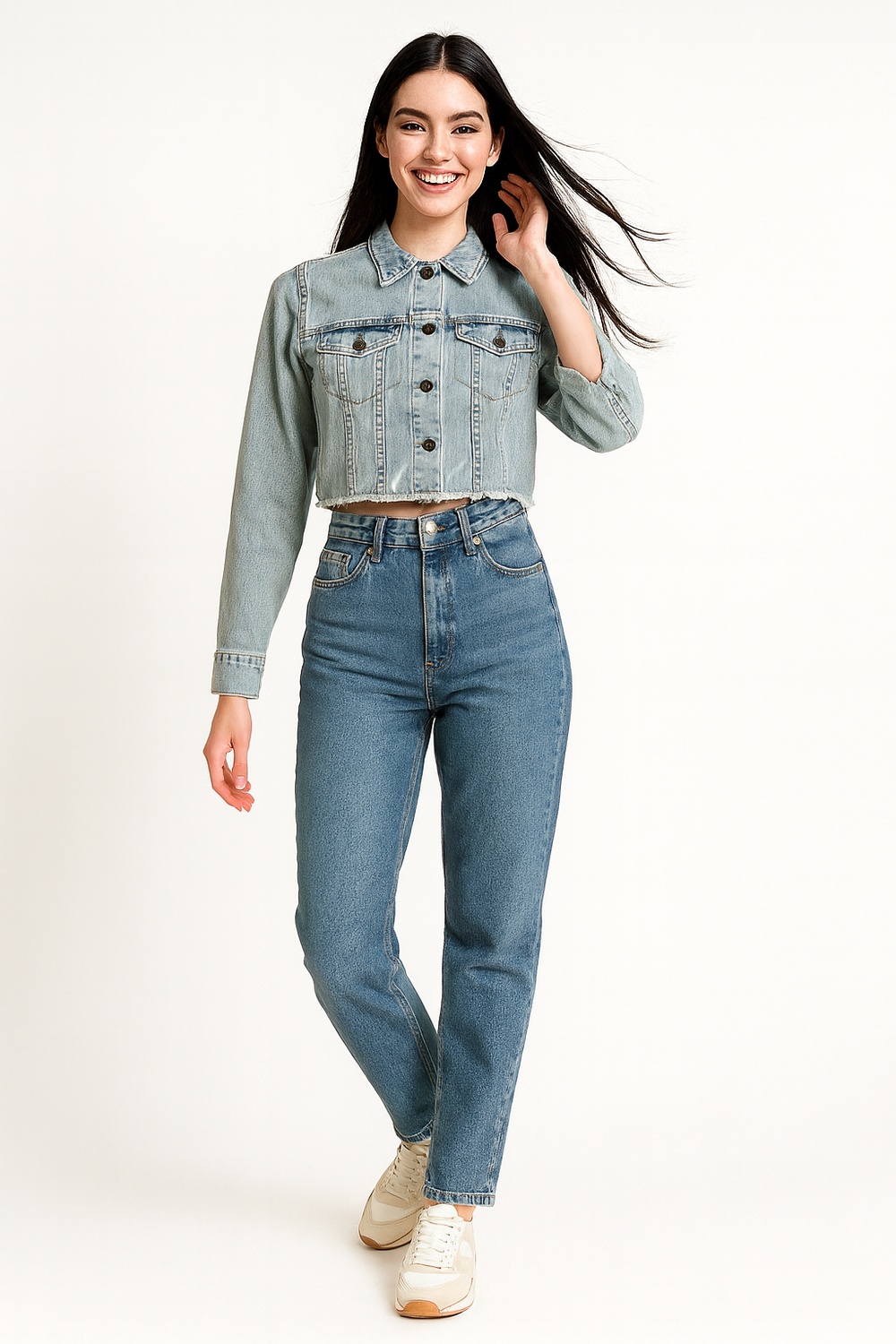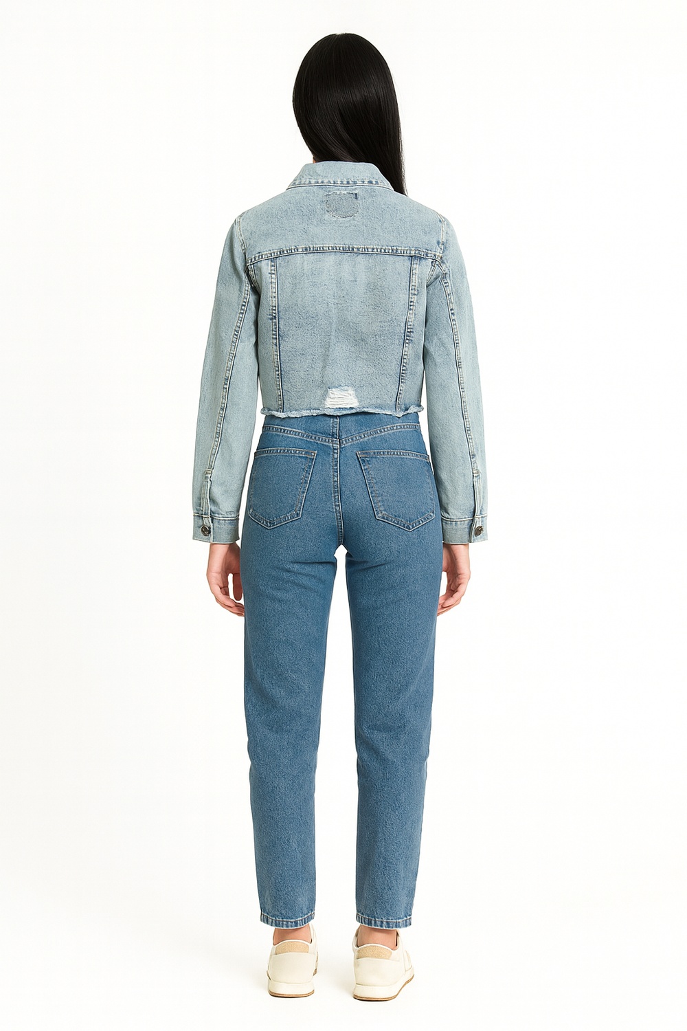 Chamarra de mezclilla con corte corto que define la cintura y resalta la figura, cierre de botones al frente que permite un ajuste práctico y moderno, bolsillos decorativos que añaden estilo funcional, terminado deshilado que aporta un toque juvenil y contemporáneo