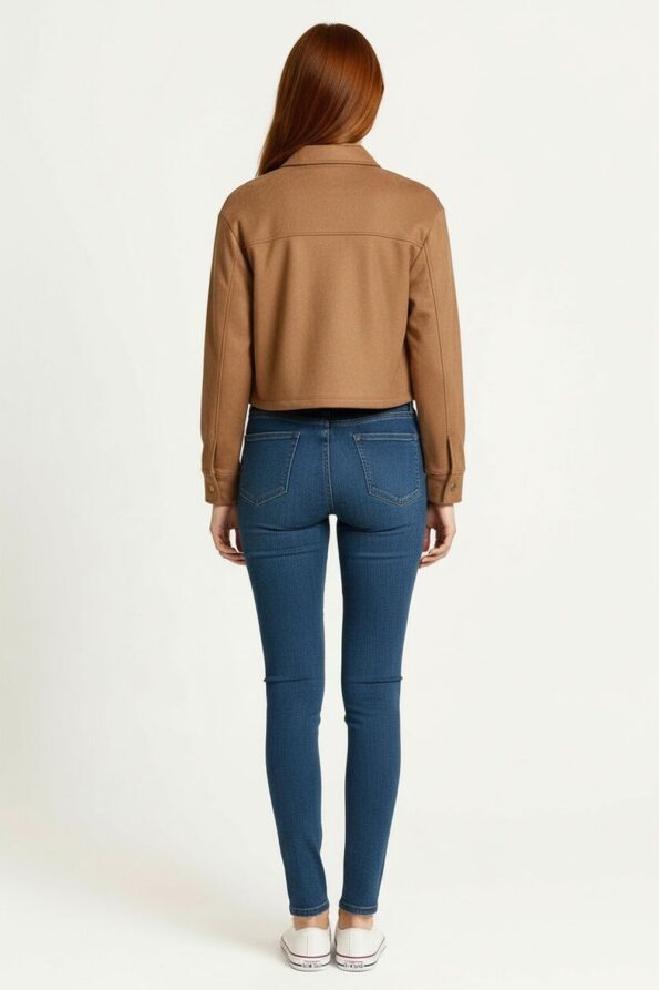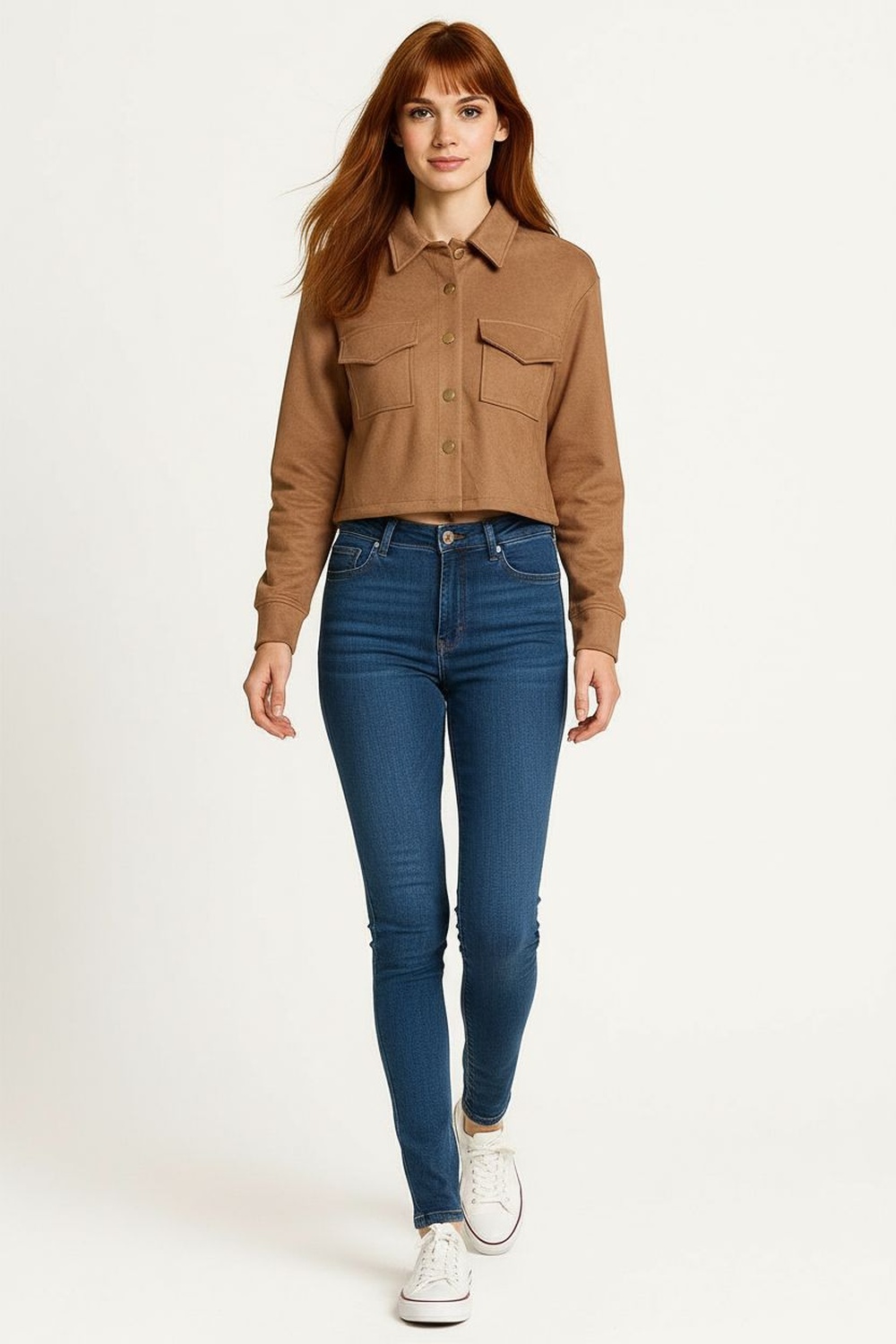 Chaqueta corta de manga larga con cuello camisero, confeccionada en tejido tipo sued con textura suave al tacto, diseño estructurado con bolsas frontales de solapa que aportan funcionalidad y estilo, cierre con botones metálicos que añaden un toque moderno, acabados reforzados que garantizan durabilidad y confort