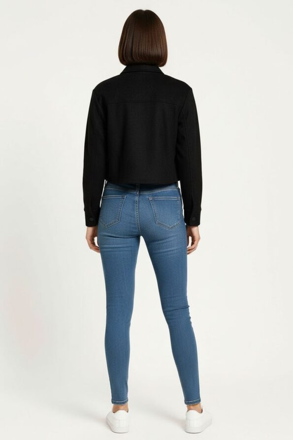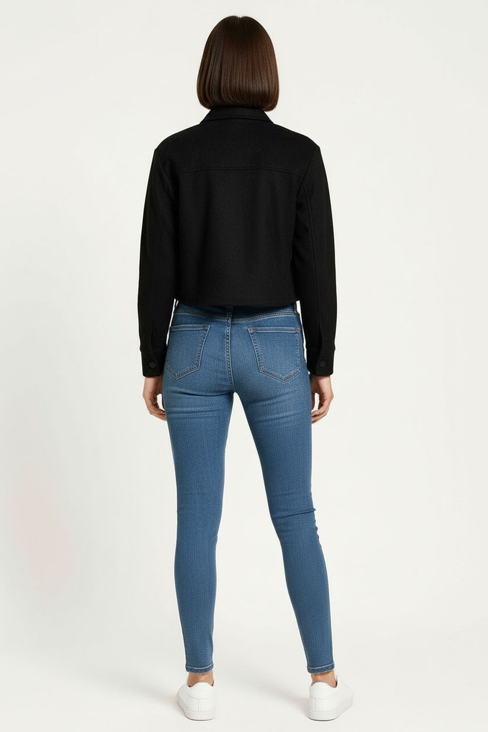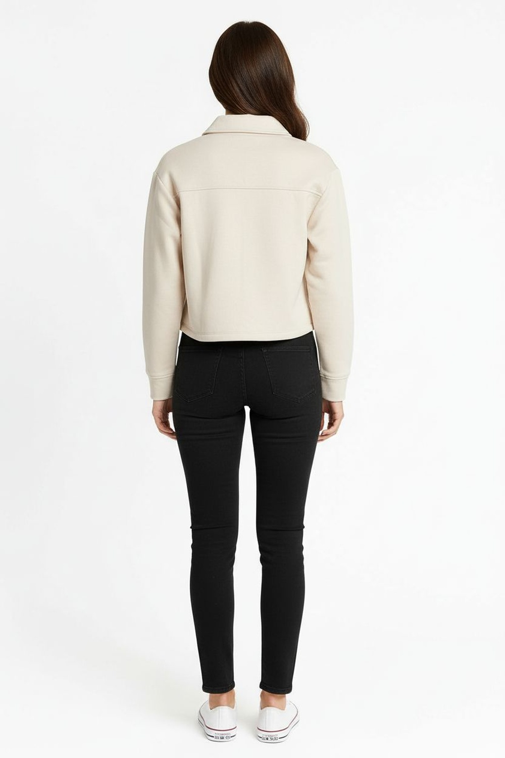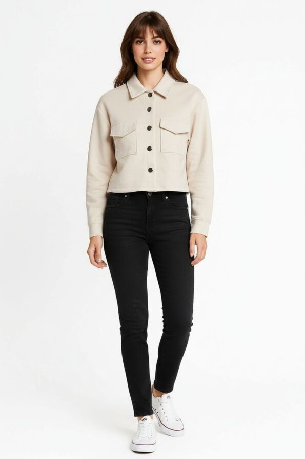 Chaqueta corta de manga larga confeccionada en tela sherpa suave que aporta calidez, cuello camisero estructurado que realza el diseño, cierre frontal con botones decorativos que añaden un detalle sofisticado, bolsas de parche al frente que brindan funcionalidad, dobladillo con ajuste elástico que asegura comodidad