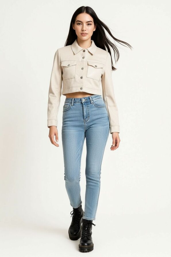 Chaqueta corta con cuello camisero y cierre frontal de botones metálicos, diseño estructurado que combina textura suave con aplicaciones al tono, bolsillos superiores con tapa que aportan funcionalidad y estilo, confección en tejido firme que brinda comodidad y durabilidad, dobladillo recto que acentúa la silueta y aporta un acabado moderno