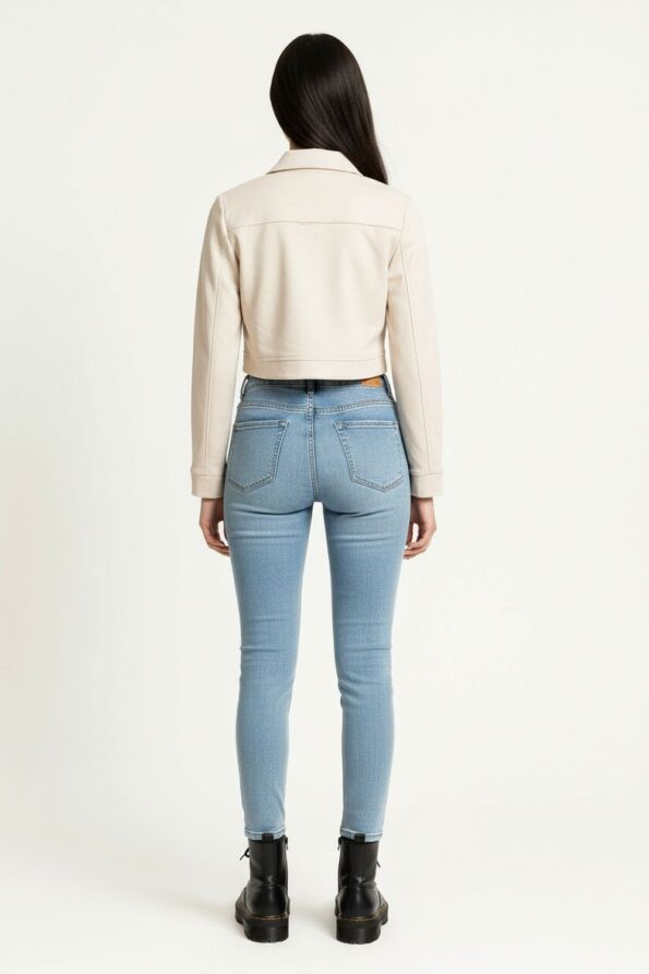 Chamarra corta de mezclilla con mangas plisadas que aportan volumen y estilo distintivo, cuello camisero clásico que realza la estructura del diseño, cierre frontal con botones metálicos que ofrecen un toque urbano, bolsillos frontales con solapa funcionales, pretina ajustada que define la silueta y resalta la cintura, confección en denim resistente con acabado suave al tacto