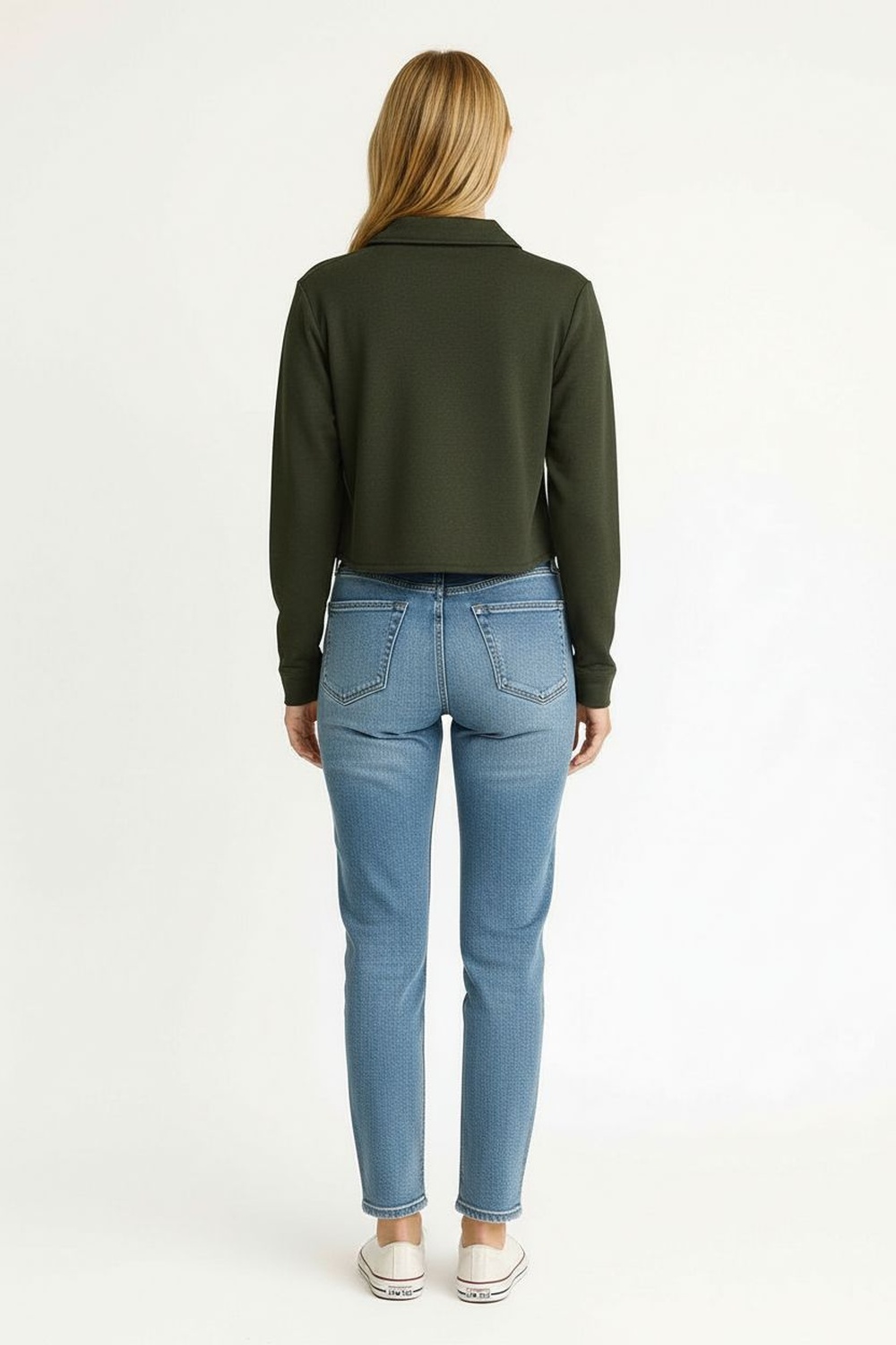 Chaqueta corta con cuello camisero y botonadura frontal, confeccionada en tejido firme tipo french con textura suave, bolsillos frontales con tapa y manga larga, corte ajustado que brinda estructura al cuerpo