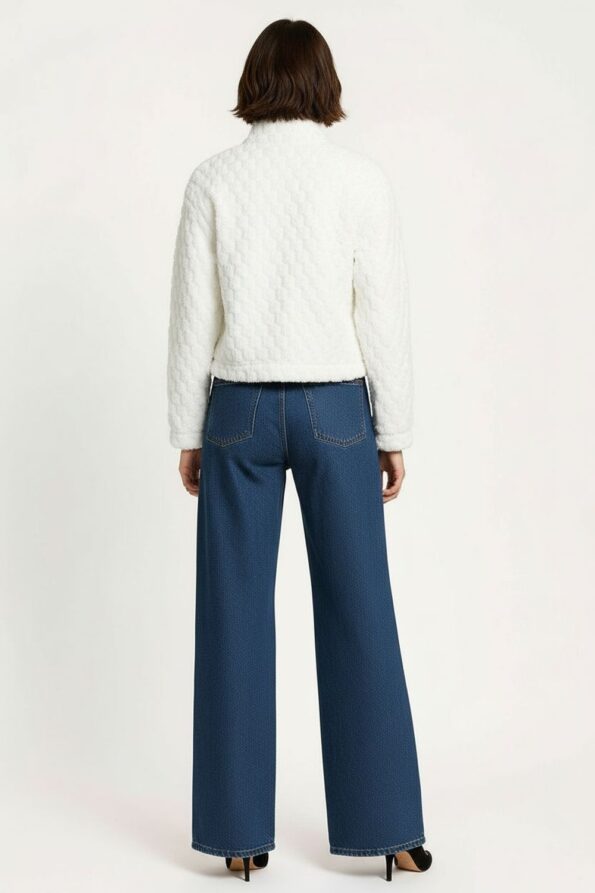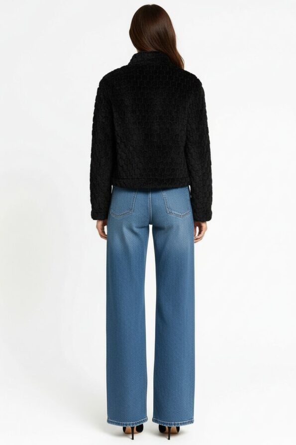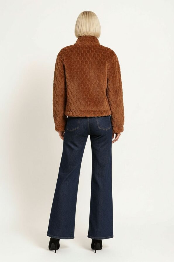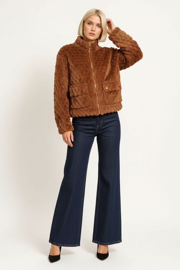 Chamarra corta con cuello alto y cierre frontal, confeccionada en tejido suave de textura aterciopelada que aporta calidez y confort, diseño estructurado con ajuste en cintura que realza la figura, acabado interno reforzado que brinda durabilidad y comodidad en cada uso, manga larga con puño elástico que mejora el ajuste y protege del frío